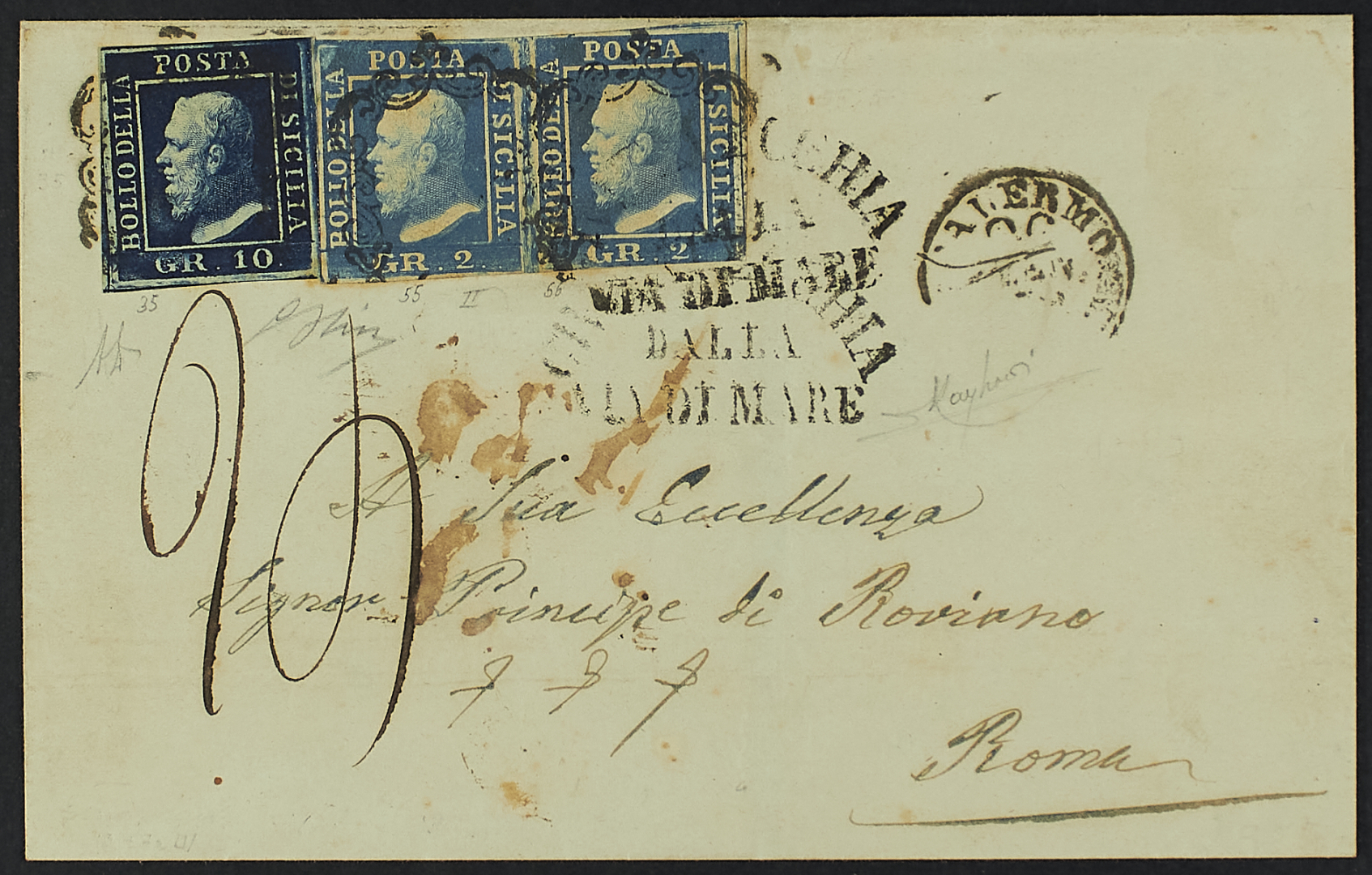 1859 - 10 gr. indaco + 2 gr. II tavola cobalto coppia orizzontale su lettera del 26 gennaio da Palermo per Roma tassata in arrivo per 24 baj. e viaggiata con il vapore "Corriere Siciliano" - Da esaminare - Cert. Diena - Firme Oliva e Raybaudi