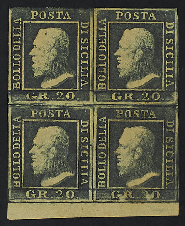 1859 - 20 gr. grigio ardesia blocco di quattro bordo di foglio inferiore (pos. 84/85 - 94/95) - Firme E.D. e A.D.