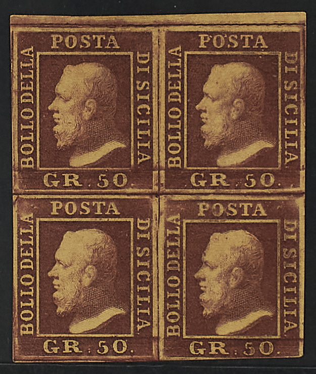 1859 - 50 gr. lacca bruno blocco di quattro bordo di foglio superiore (pos. 2/3 - 12/13) - Cert. Diena