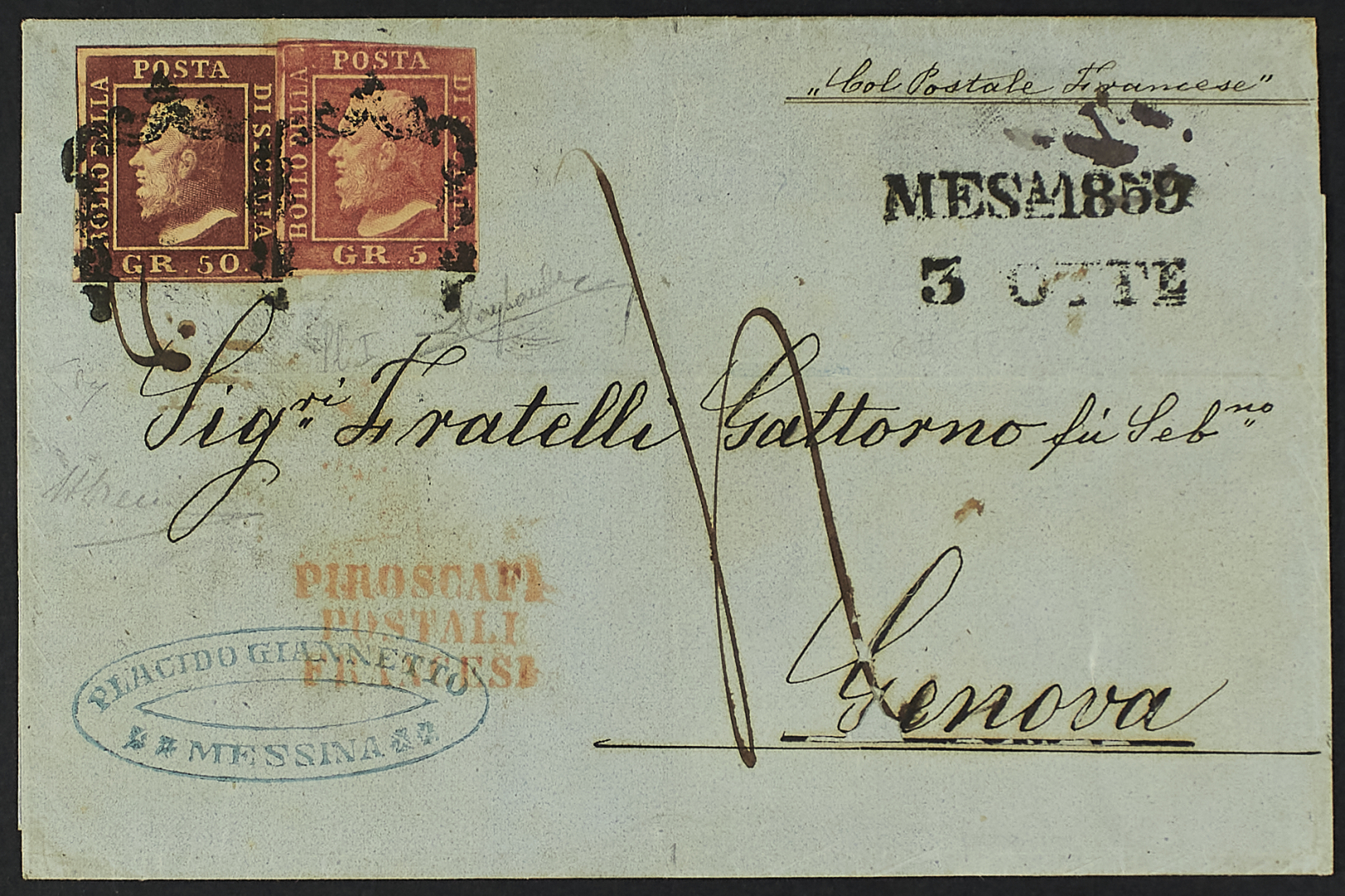 1859 - 50 gr. lacca bruno + 5 gr. I tavola rosa carminio su lettera del 3 ottobre da Messina per Genova viaggiata coi piroscafi postali francesi - Alto valore ben marginato - Molto raro - Cert. Diena - Firma Raybaudi