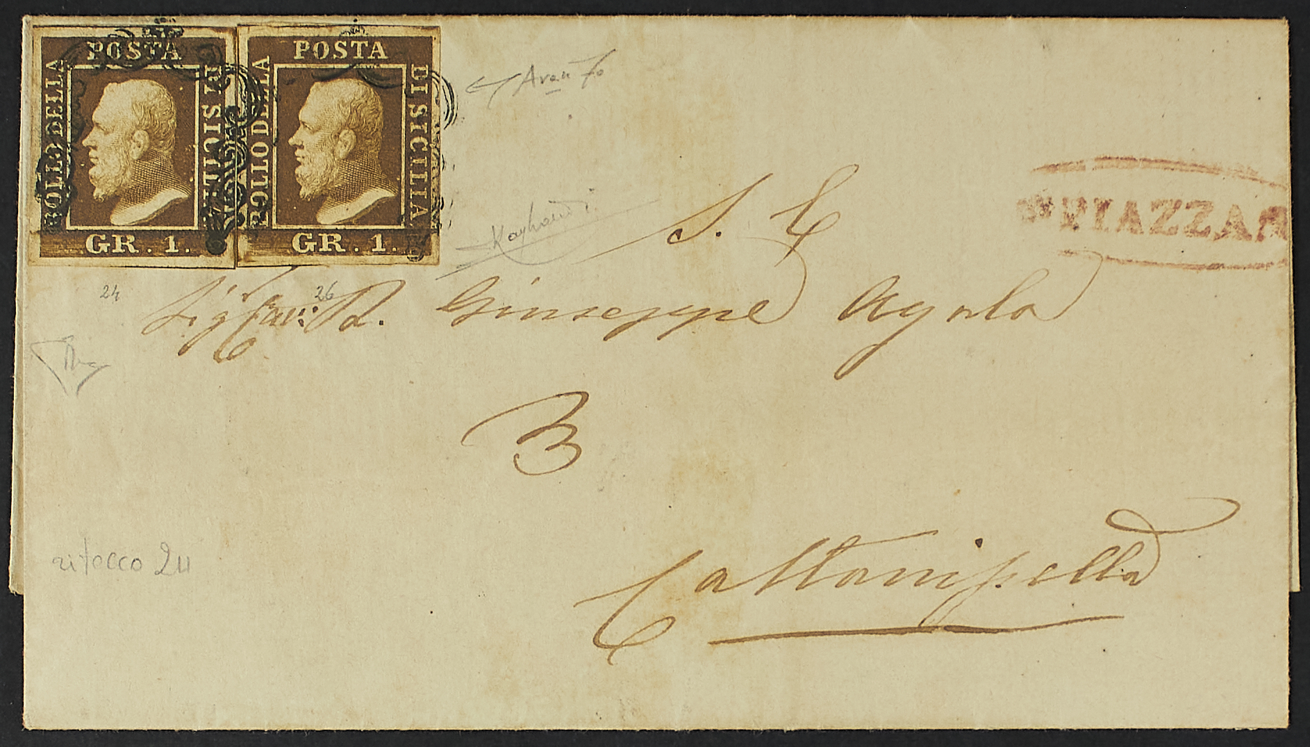 1859 - 1 gr. I tavola bruno ruggine due esemplari pos. 24 "ritocco" e 26 su lettera del 28 aprile da Piazza per Caltanissetta - Documento di eccezionale bellezza - Cert. Diena - Firme Avanzo e Raybaudi