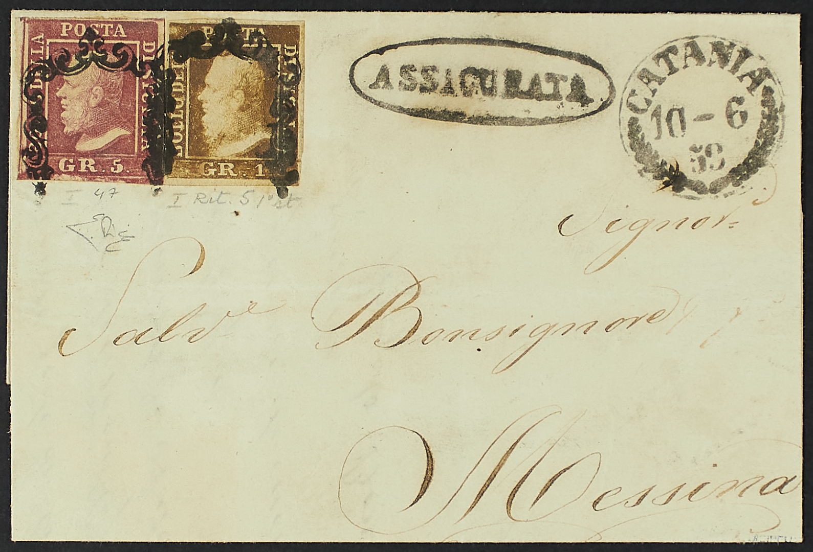 1859 - 1 gr. I tavola bruno ruggine pos. 51 "ritocco" + 5 gr. I tavola rosa carminio su assicurata del 10 giugno da Catania per Messina - Firma En. Diena