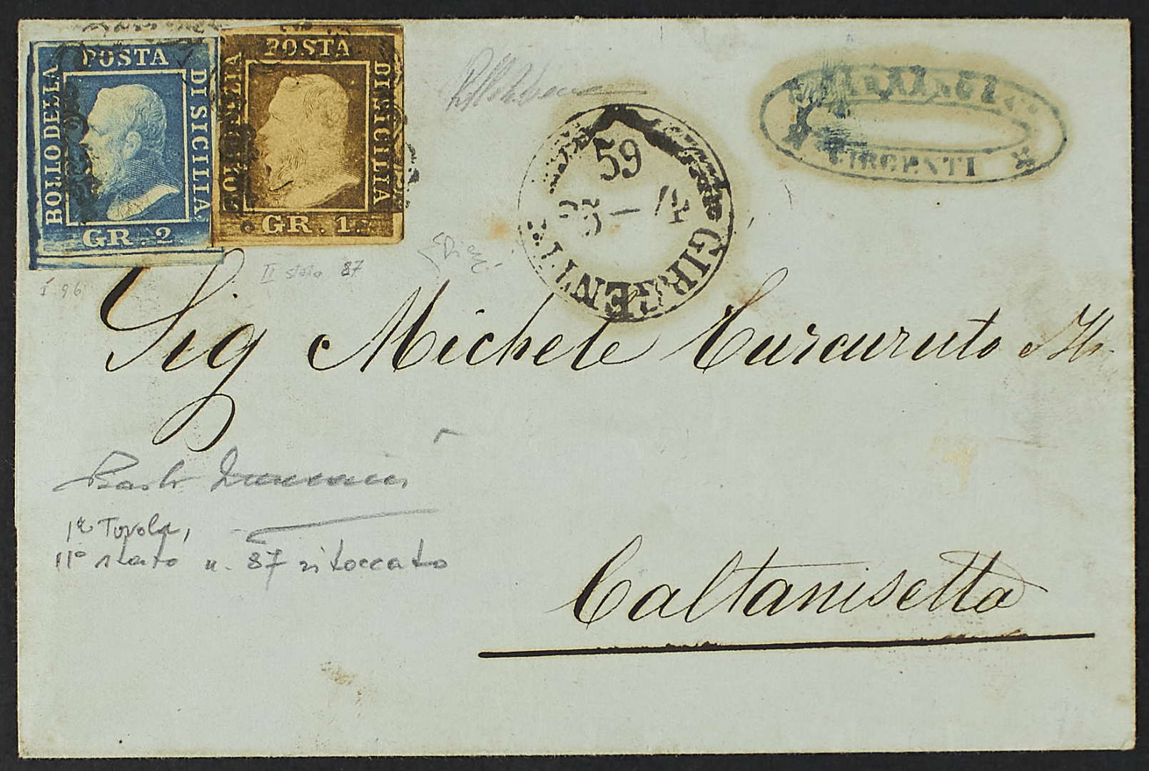 1859 - 1 gr. I tavola bruno olivastro III stato pos. 87 "ritocco" + 2 gr. I tavola azzurro carta di Napoli su lettera del 25 aprile da Girgenti per Caltanissetta - Molto rara e di notevole freschezza - Cert. Diena