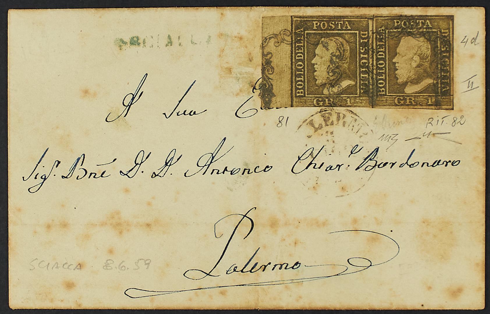 1859 - 1 gr. II tavola - Due lettere entrambe affrancate con due esemplari comprendenti rispettivamente i "ritocchi" 82 e 89 - Da esaminare - Firma E.D.