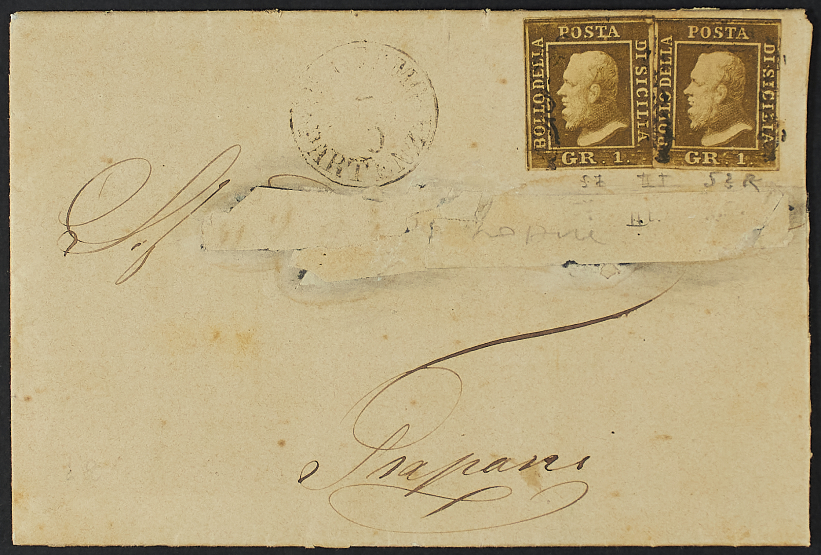 1859 - 1 gr. II tavola bruno oliva due esemplari pos. 52 "ritocco" e 57 su lettera del 2 agosto da Palermo per Trapani - Indirizzo parzialmente rifatto