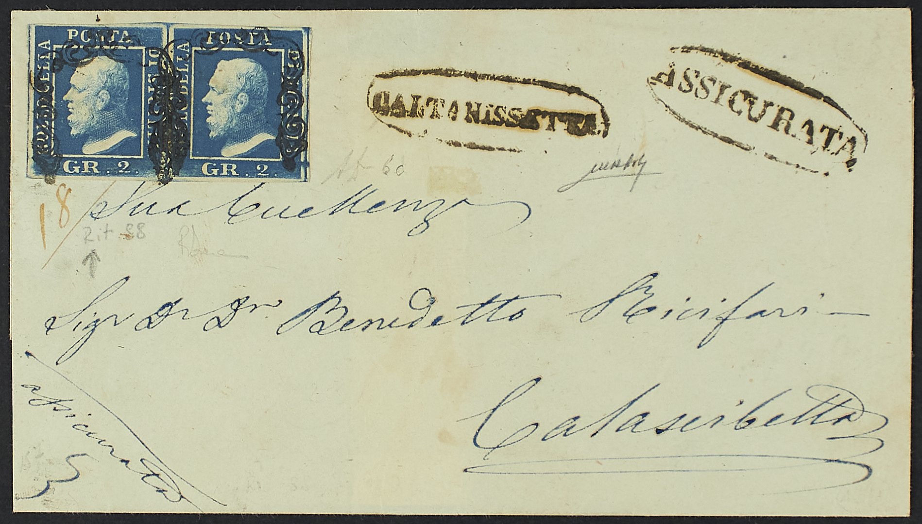 1859 - 2 gr. I tavola cobalto coppia orizzontale (pos. 88 "ritocco" / 89) su assicurata da Caltanissetta, ovale sulla soprascritta, per Calascibetta - Firma A.D.