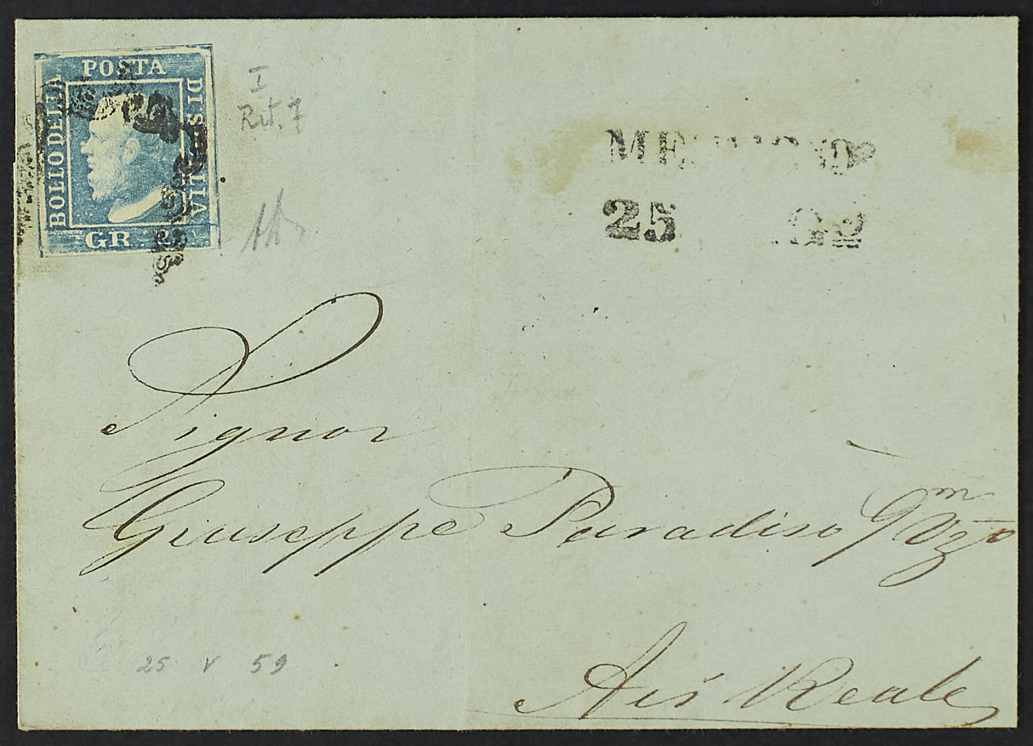 1859 - 2 gr. I tavola azzurro chiaro pos. 7 "ritocco" su lettera del 25 maggio da Messina per Acireale - Firma A.D.