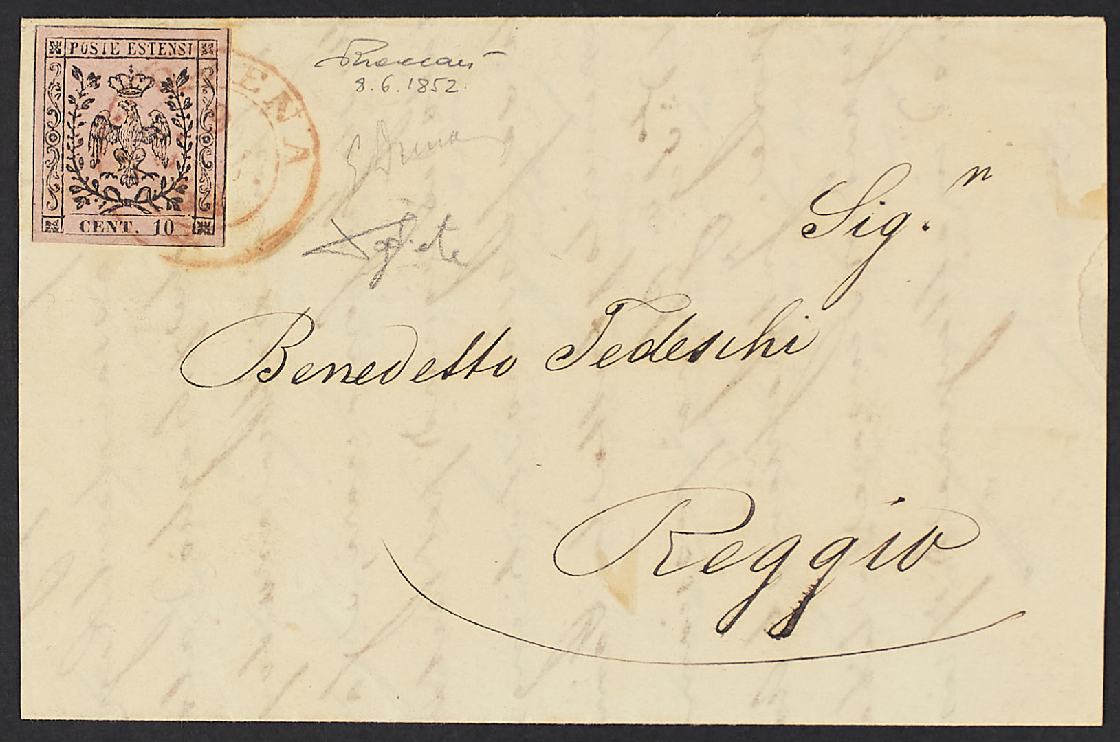 1852 - Modena - Doppio cerchio in rosso annullatore di 10 c. rosa chiaro senza punto dopo le cifre su lettera dell'8 giugno per Reggio - Rara