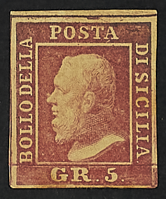 1859 - 5 gr. I tavola rosa carminio - I cinque "ritocchi" conosciuti - Unito 5 gr. II tavola vermiglio pos. 90 "ritocco" - Insieme non comune - Da esaminare - Cert. Bottacchi e Diena - Firme Cardillo, Colla, Fiecchi e Raybaudi