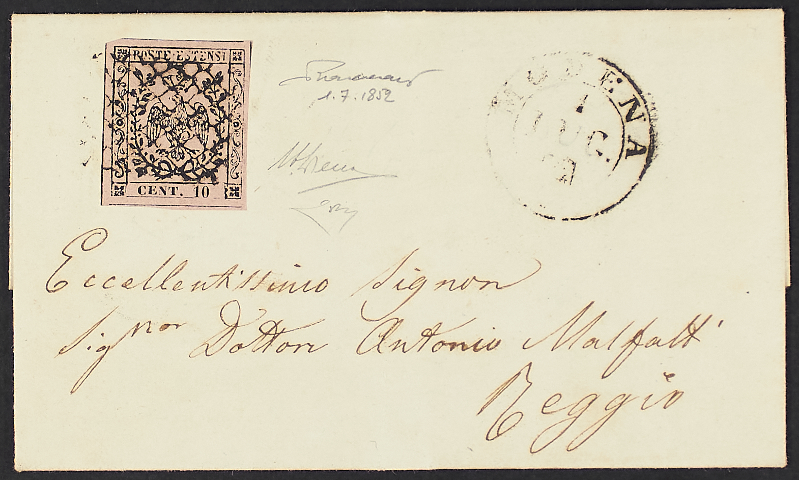 1852 - Modena - Griglietta annullatrice di 10 c. rosa chiaro senza punto dopo le cifre, doppio cerchio a lato, su lettera del 1° luglio per Reggio - Rara e splendidamente conservata - Cert. Diena