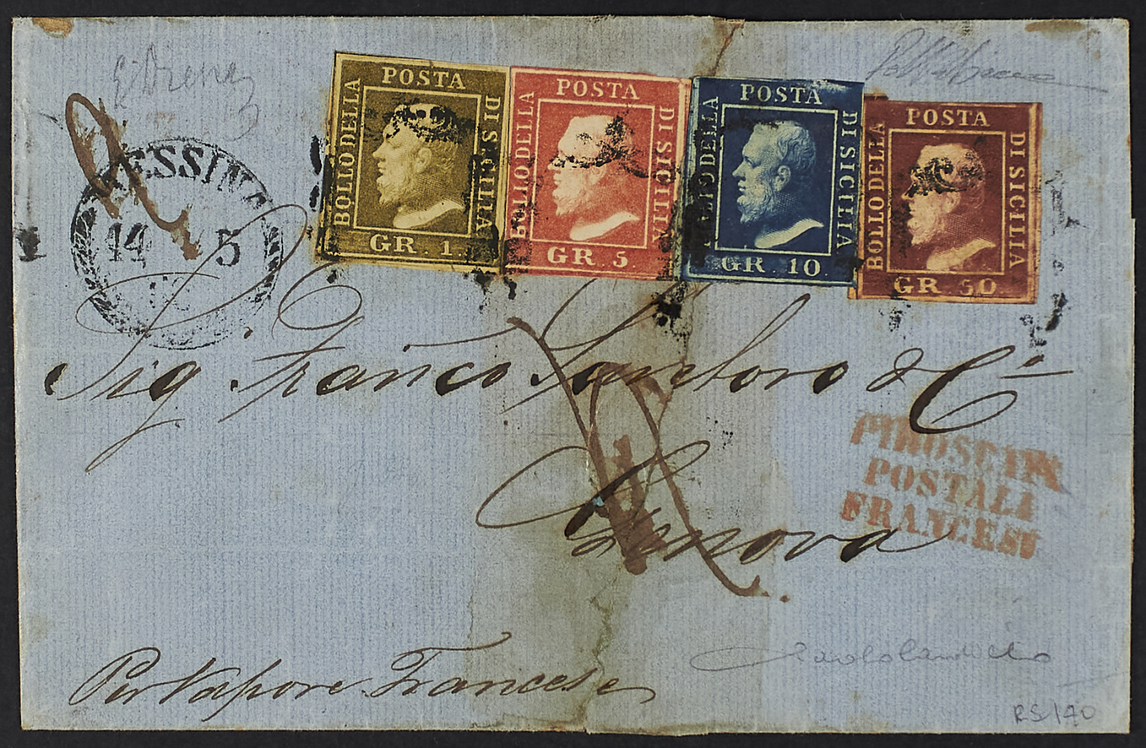 1859 - 1 gr. III tavola verde oliva carta di Napoli + 5 gr. II tavola vermiglio + 10 gr. azzurro cupo pos. 60 "ritocco" + 50 gr. lacca bruno pos. 93 "ritocco" in affrancatura "quadricolore" su lettera del 14 maggio 1860 (primo giorno della dittatura di Garibaldi in Sicilia) da Messina per Genova viaggiata con il piroscafo francese "Quirinal" - Unita nota e grande rarità di Sicilia - Cert. Cardillo e Diena