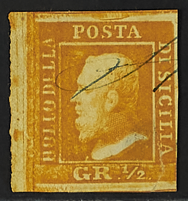 1/2 GR. I TAVOLA ARANCIO CARTA DI PALERMO BORDO DI FOGLIO A SINISTRA CON LEGGERA DOPPIA STAMPA