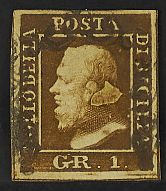 1859 - 1 gr. I tavola bruno ruggine I stato (pos. 70) con falla di stampa conseguente alla rottura del retino calcografico - Unico noto - Cert. Bottacchi