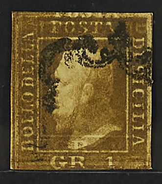 1859 - 1 gr. II tavola bruno oliva doppia stampa in senso verticale - Da esaminare - Cert. Cardillo e Marone