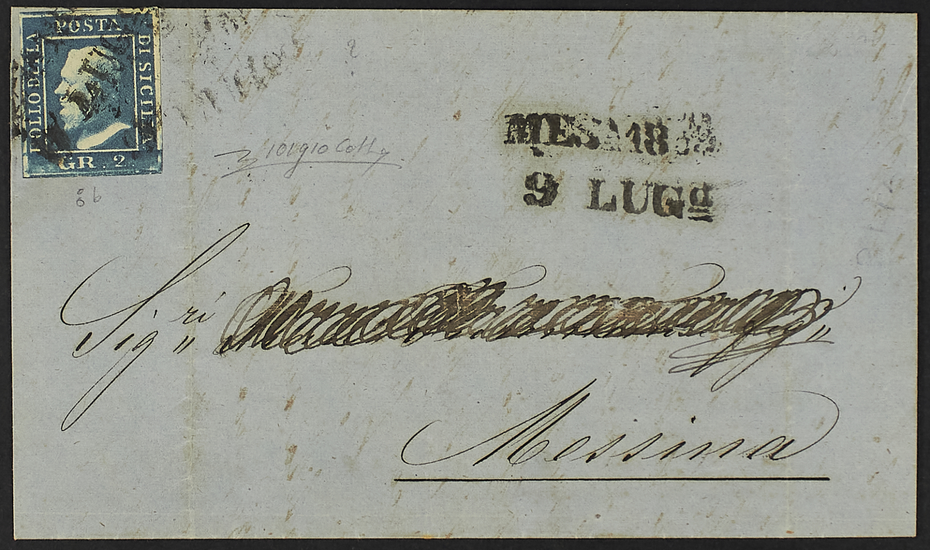 1859 - Messina - Stampatello diritto annullatore in arrivo di 2 gr. III tavola azzurro verdastro su lettera del 9 luglio da Catania impostata sul battello - Estremamente raro - Cert. Colla