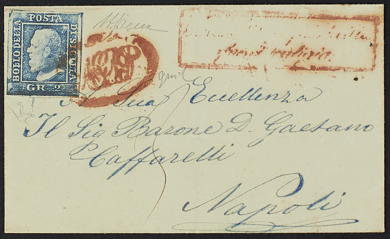 1859 - AGDP - Corsivo in ovale in rosso annullatore di 2 gr. I tavola azzurro chiaro carta di Palermo su lettera insufficientemente affrancata del dicembre da Catania per Napoli impostata direttamente al piroscafo - Documento molto bello e di rarità estrema - Cert. Diena - Firma Nino Aquila