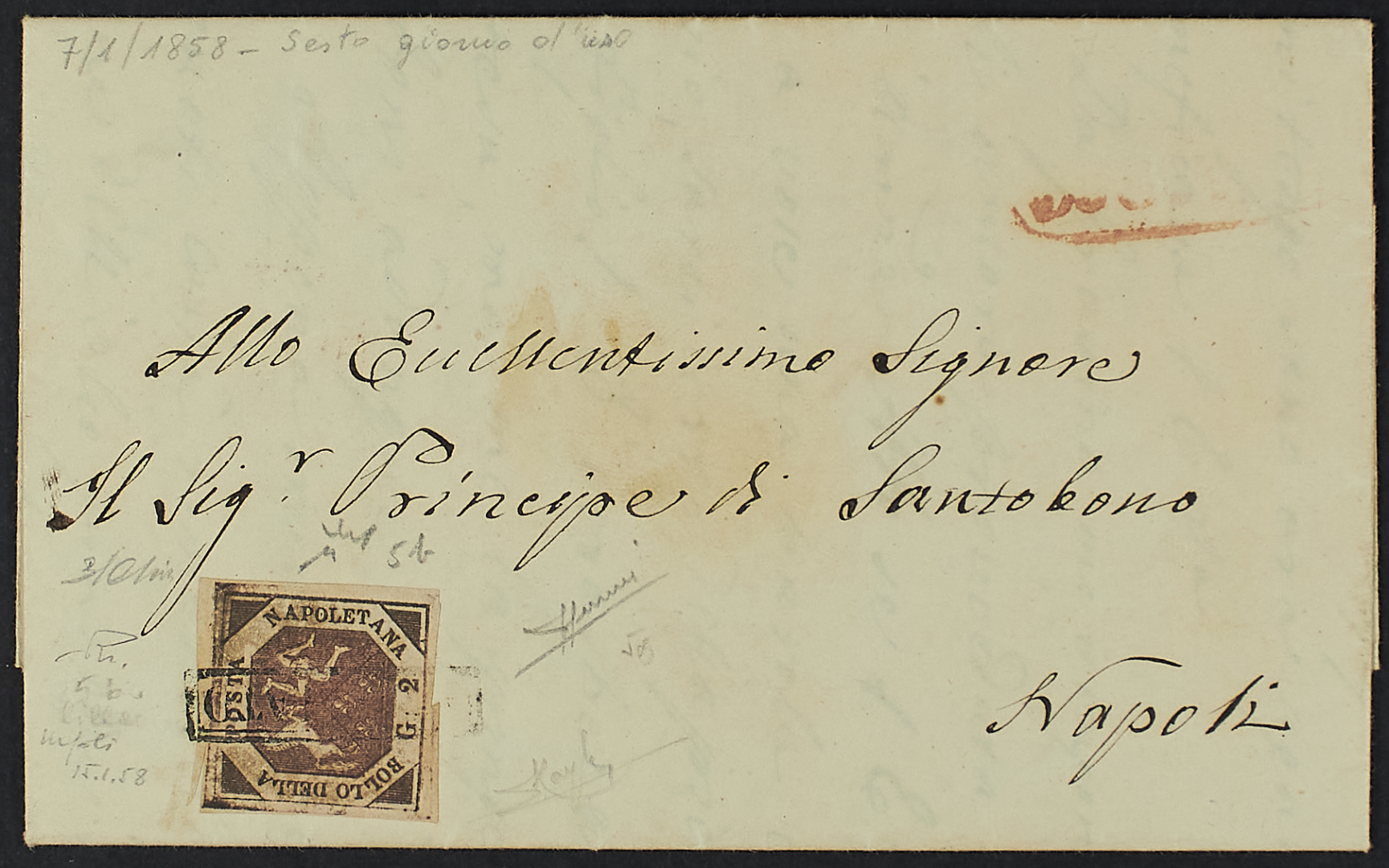 1858 - 2 gr. I tavola lilla rosa su lettera del 7 gennaio (sesto giorno d'uso) da S. Agata per Napoli - Molto bella - Cert. Savarese - Chiavarello, Raybaudi e Sorani