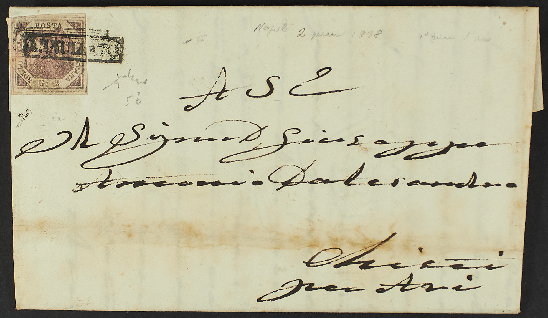 1858 - Giorno d'emissione - 2 gr. I tavola lilla rosa su lettera del 1° gennaio da Napoli per Chieti con bollo al verso del 2 gennaio (primo giorno d'uso) dell'ufficio di S. Ferdinando e Chiara - Cert. Cardillo