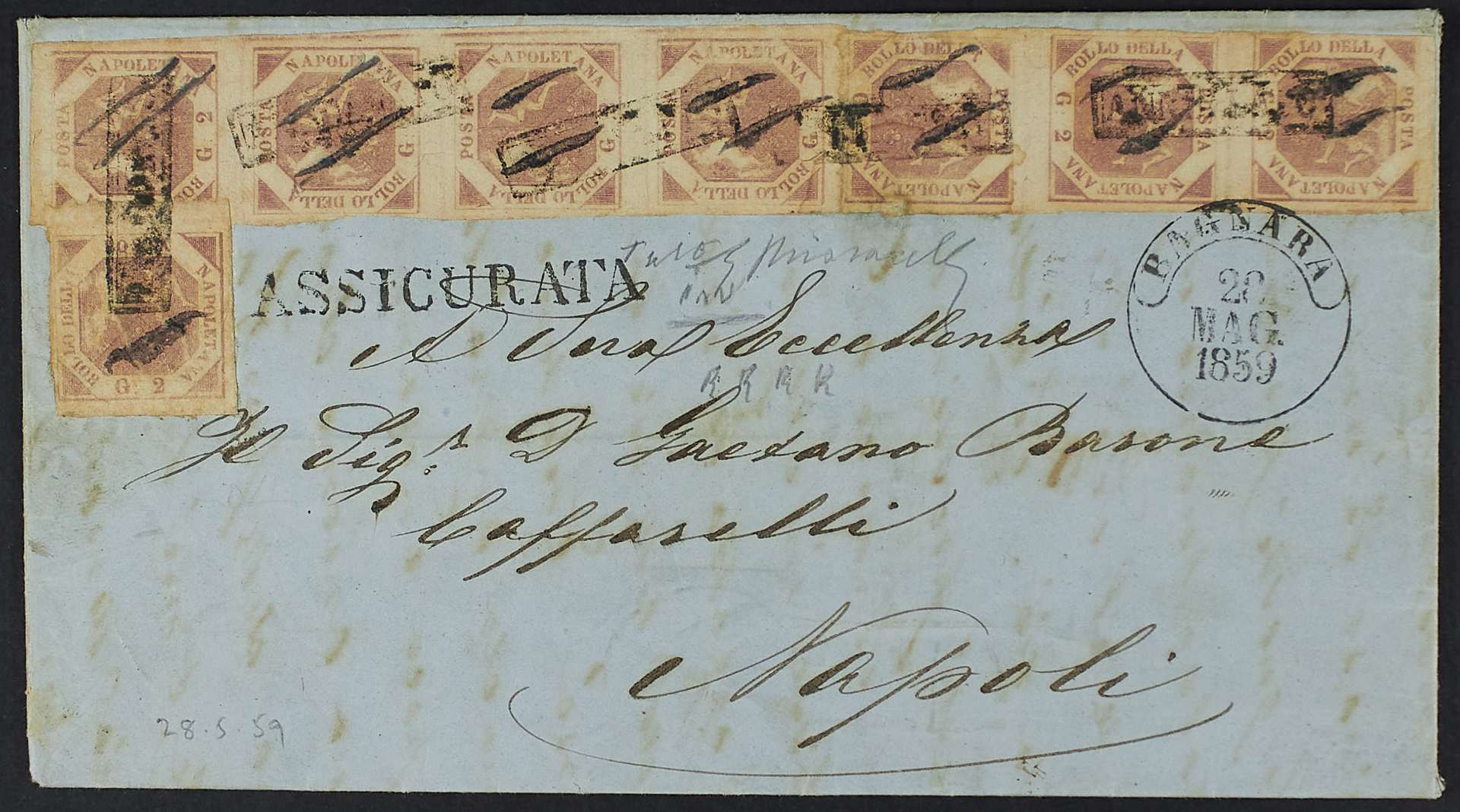 1858 - 2 gr. III tavola rosa brunastro striscia verticale di quattro + striscia verticale di tre ed esemplare singolo annullati con cartella e tratti di penna su assicurata del 28 maggio 1859 da Bagnara per Napoli - Alcuni difetti ma affrancatura non comune e scenografica - Da esaminare - Firma Chiavarello