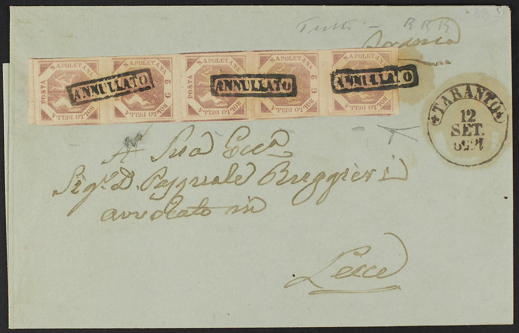 1858 - 2 gr. III tavola rosa brunastro striscia verticale di cinque esemplari annullata dalla cartella di Taranto , cerchio in nero a lato, su lettera del 12 settembre 1859 per Lecce - Documento molto raro e ben conservato - Cert. Bottacchi