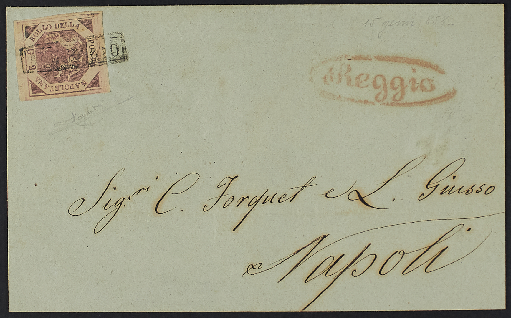 1858 - 2 gr. I tavola lilla rosa su lettera del 15 gennaio (primo mese d'uso) da Reggio per Napoli - Documento fresco e ben conservato - Cert. Raybaudi