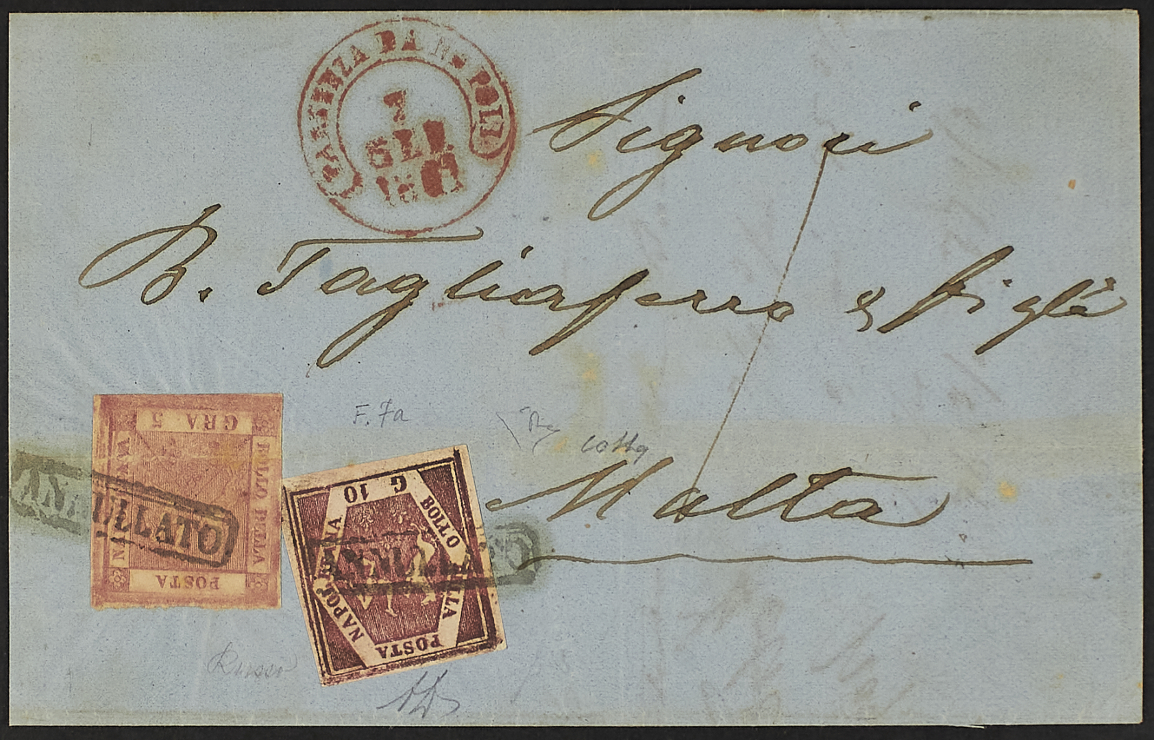 1858 - 10 gr. carminio violaceo V tipo in affrancatura con 5 gr. II tavola carminio vivo su lettera del 7 gennaio 1861 da Napoli per Malta - Molto rara - Da esaminare - Cert. Diena - Firma Colla