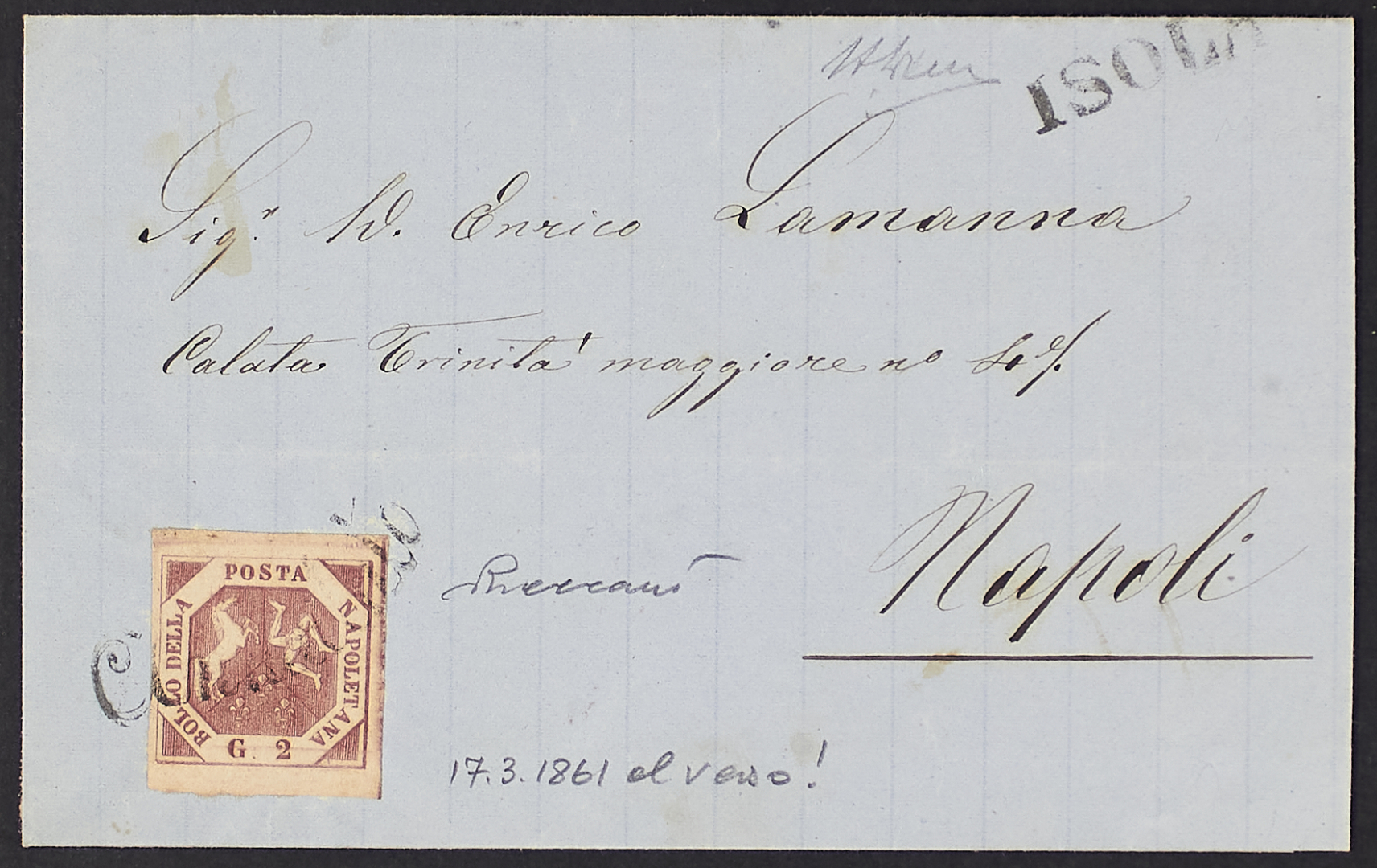 1861 - Isola - "Svolazzo" annullatore di 2 gr., stampatello a lato, su lettera del 16 marzo per Napoli con timbro di arrivo del 17 (giorno della proclamazione del Regno d'Italia) - Rara - Firma A. Diena