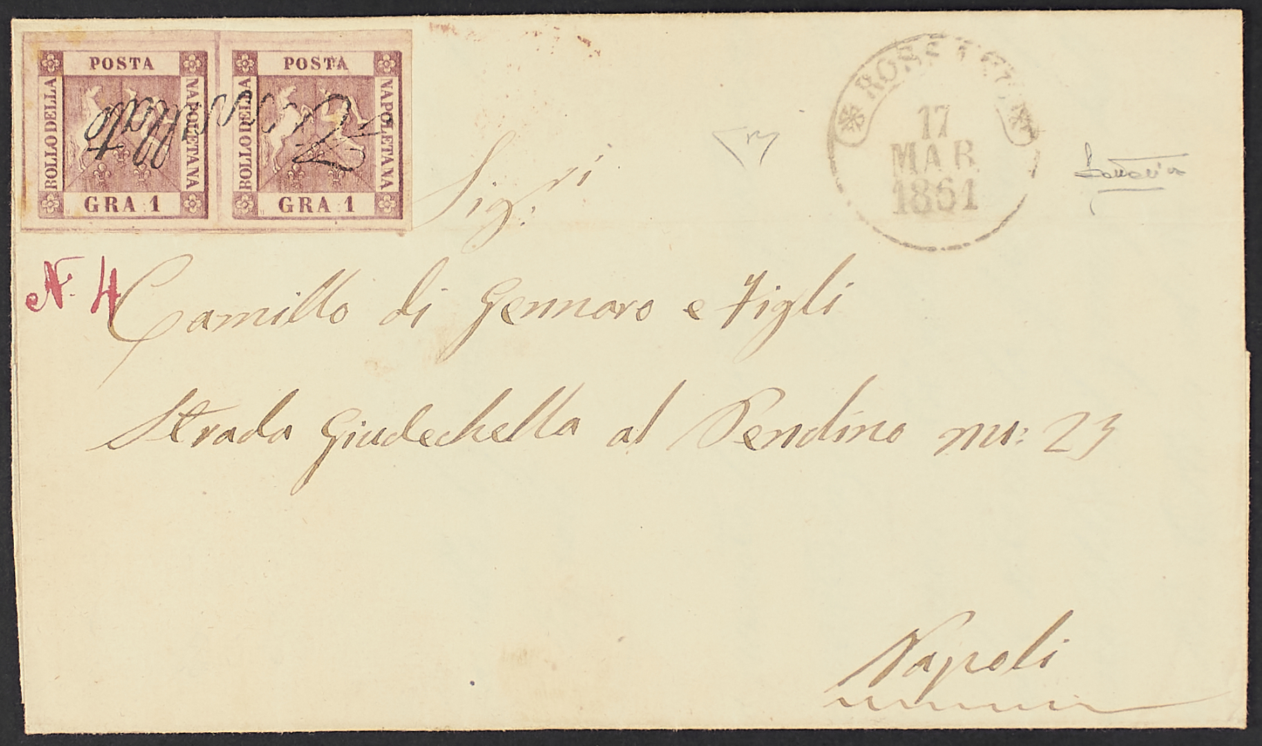 1861 - Rossano - "Svolazzo" annullatore di 1 gr. II tavola carminio coppia orizzontale su lettera del 17 marzo (giorno della proclamazione del Regno d'Italia) per Napoli - Molto bella e non comune - Cert. Diena