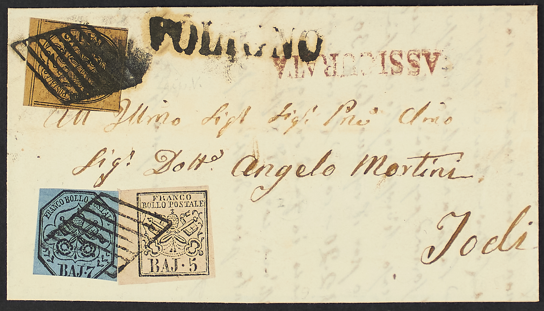 1852 - 3 baj. bistro arancio + 5 baj. rosa chiaro bordo di foglio a sinistra + 7 baj. azzurro in affrancatura "tricolore" su assicurata del 5 gennaio 1859 da Foligno per Todi - Da esaminare