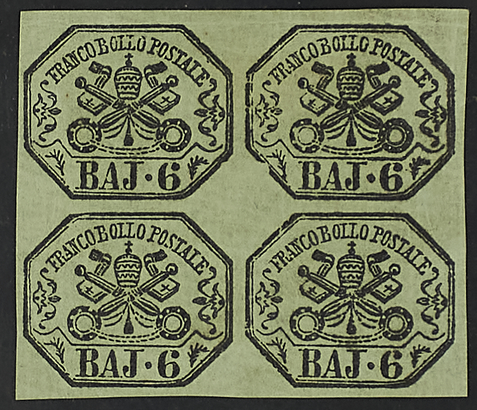 1852 - 6 baj. grigio verdastro blocco di quattro - Cert. Colla