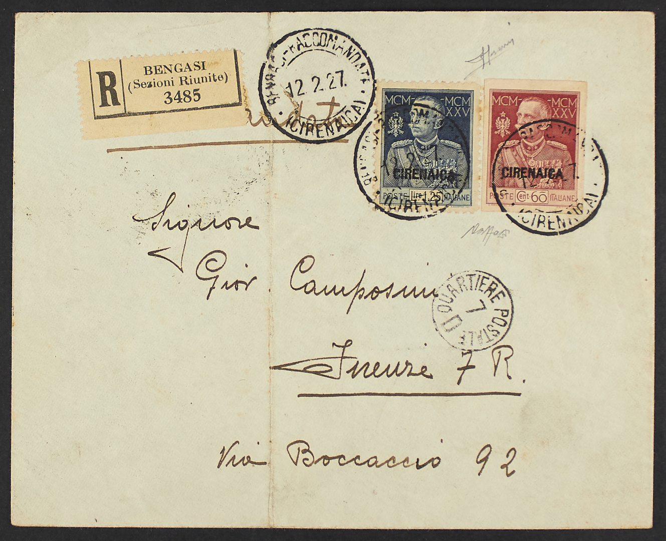 1925/26 - Giubileo 60 c. non dentellato + 1,25 L. dent. 11 su raccomandata del 12 febbraio 1927 da Bengasi per Firenze - Rara - Cert. Caffaz - Firma Sorani