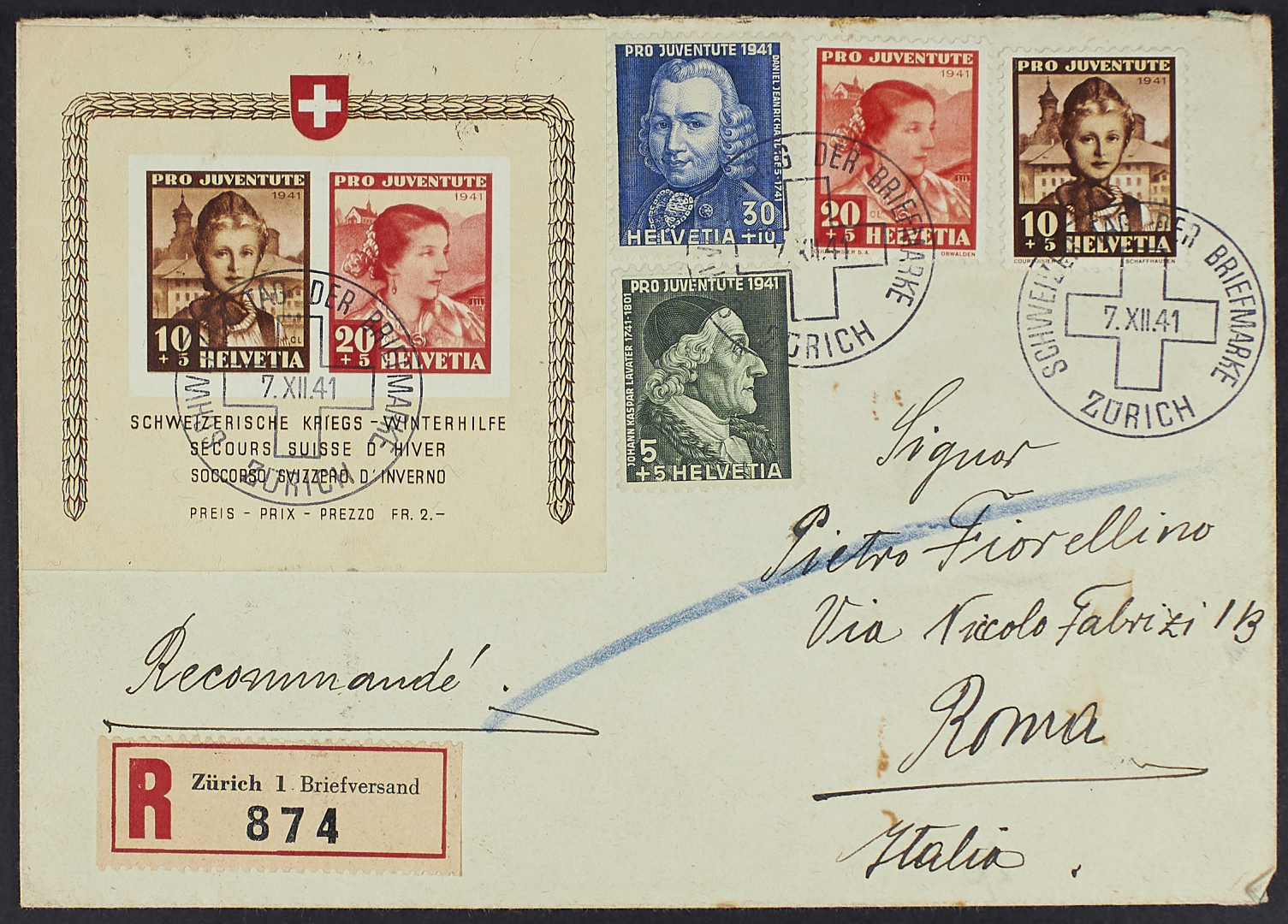 1941 - Pro Juventute - Soccorso invernale - Il foglietto con valori complementari su raccomandata del 7 dicembre da Zurigo per Roma - Non comune