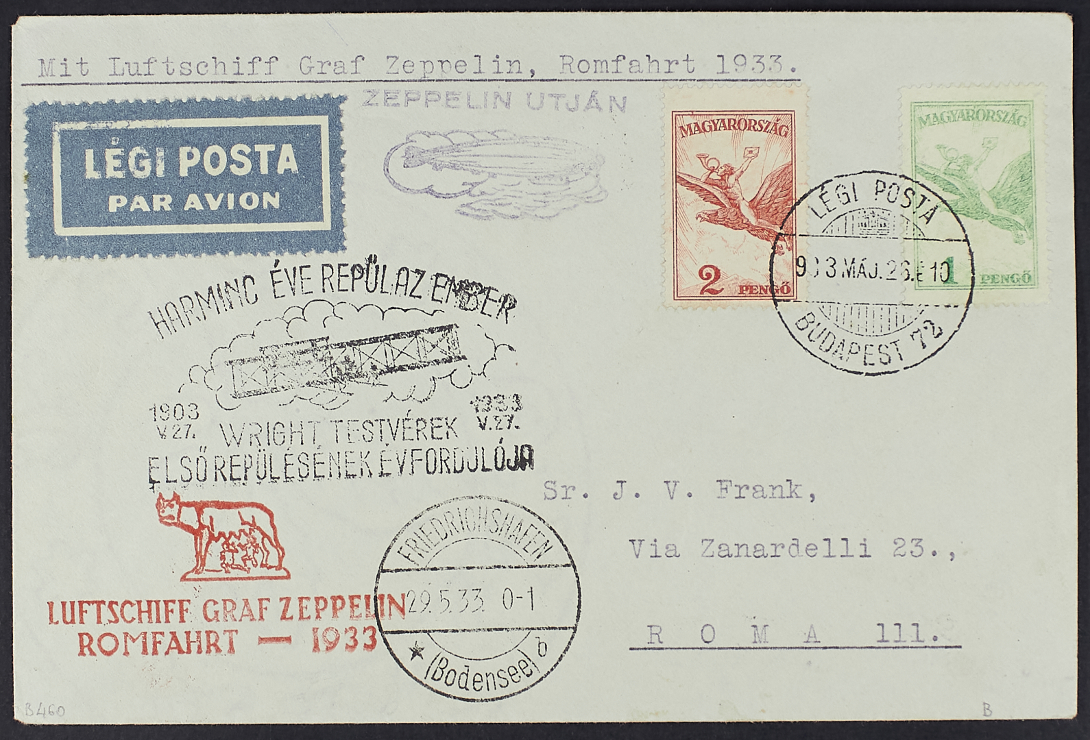 1933 - Zeppelin - Aerogramma del 26 maggio da Budapest per Roma via Friedrichshafen affrancato per 3 p. e viaggiato con il volo speciale "Romfahrt 1933"