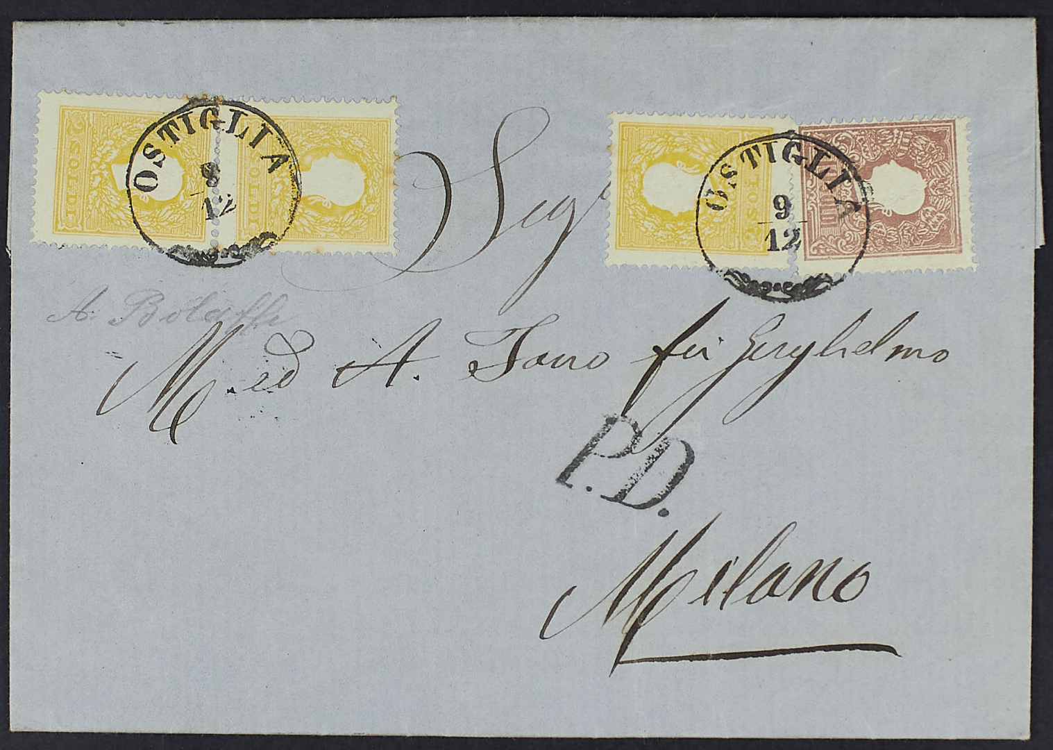 1859 - 2 s. giallo tre esemplari + 10 s. bruno su lettera del 10 dicembre 1862 da Desenzano per Milano - Documento molto fresco - Firma A. Bolaffi