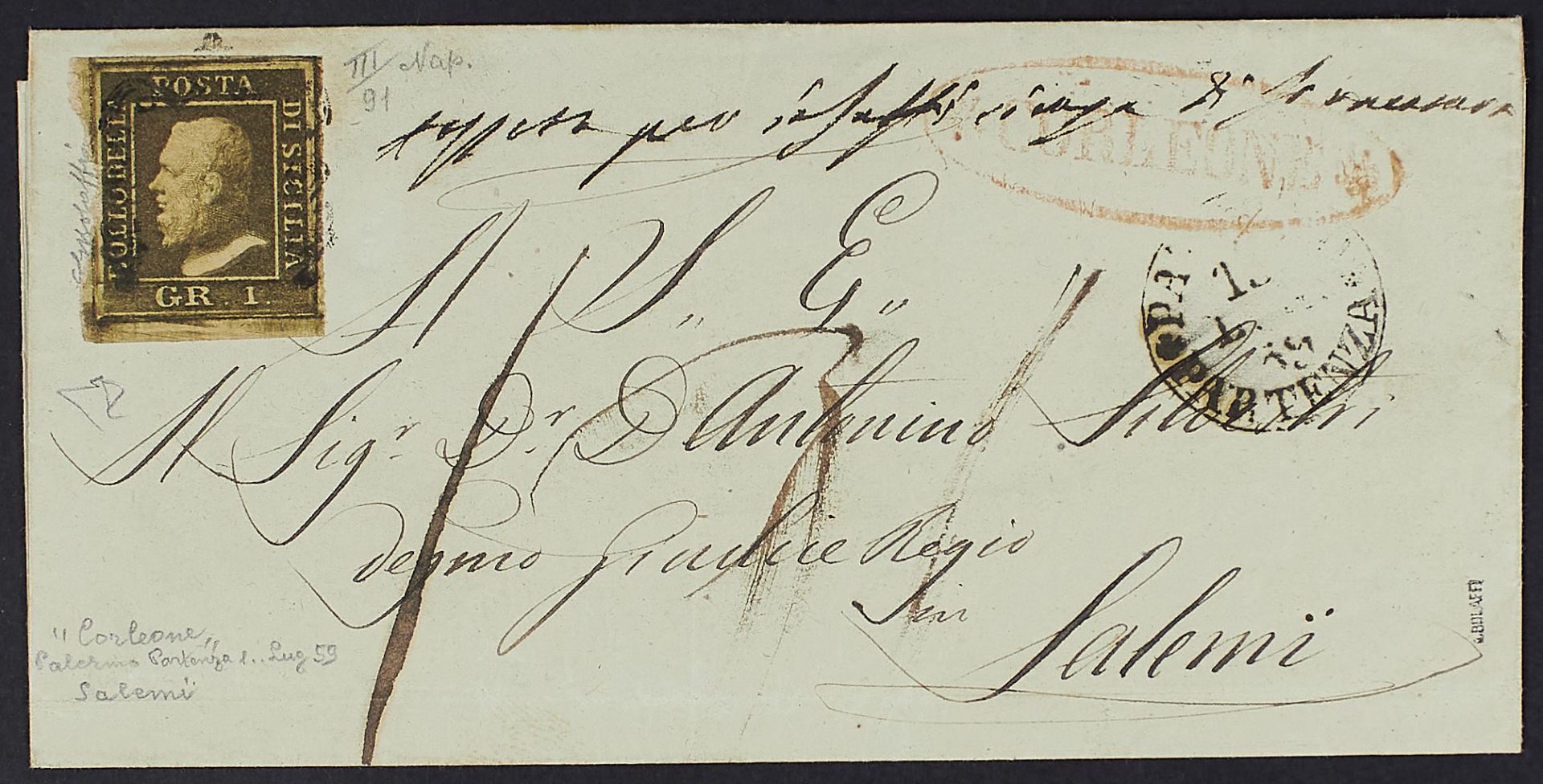 1859 - 1 gr. III tavola verde oliva bordo di foglio inferiore su involucro di lettera del 3 febbraio da Corleone per Salemi - Firme G. Bolaffi e En. D.