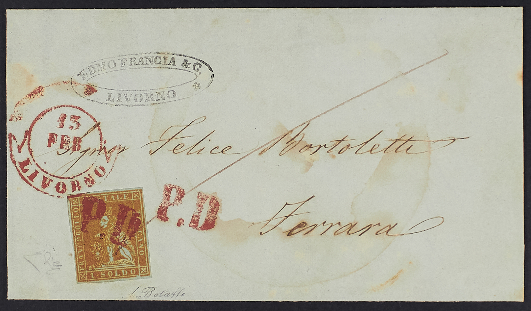 1851 - 1 s. giallo oro su carta azzurra su circolare del 13 febbraio 1857 da Livorno per Ferrara - Cert. Diena - Firma A. Bolaffi