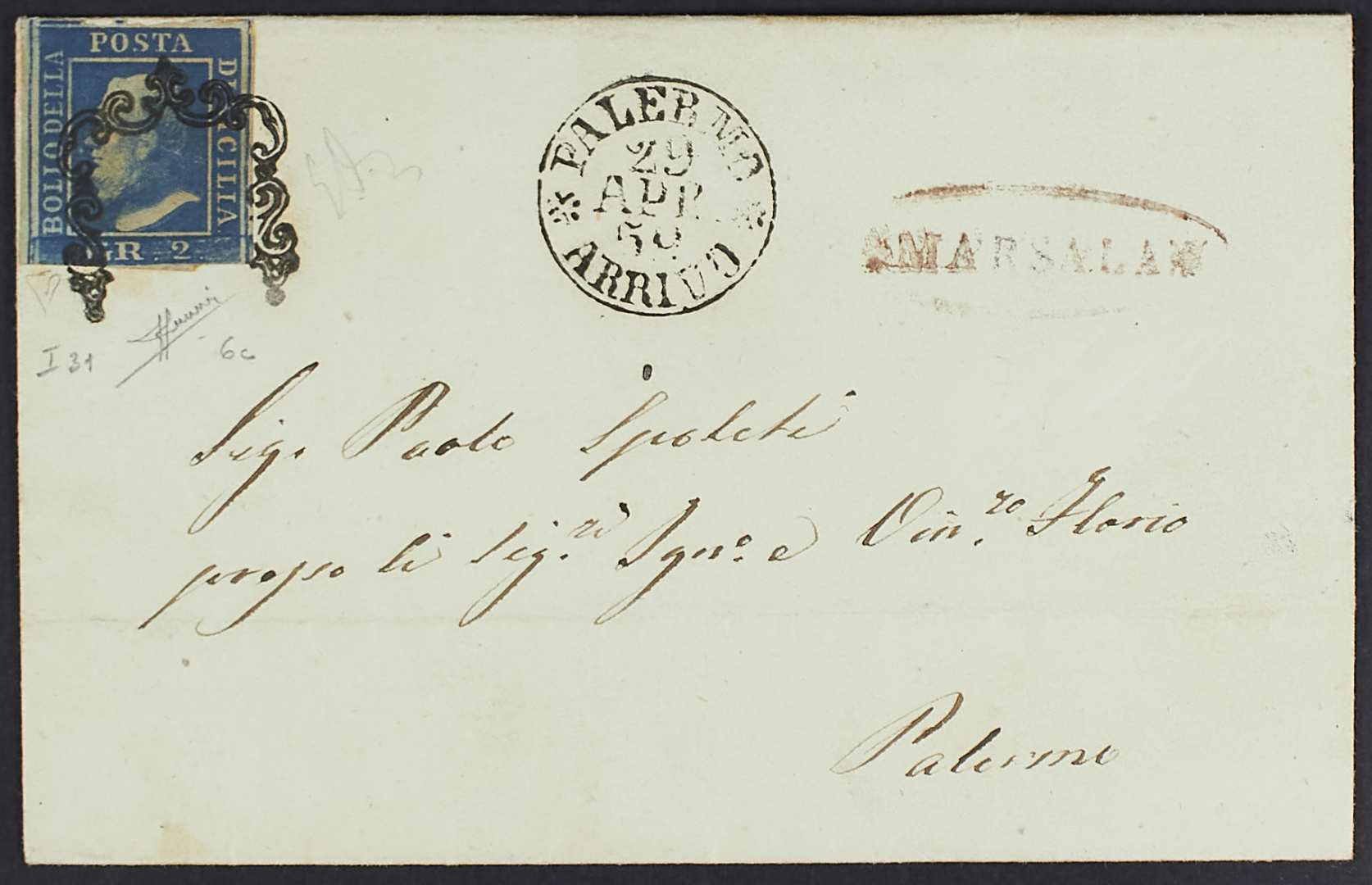 1859 - 2 gr. I tavola cobalto scuro su lettera del 28 aprile da Marsala per Palermo - Non comune - Da esaminare