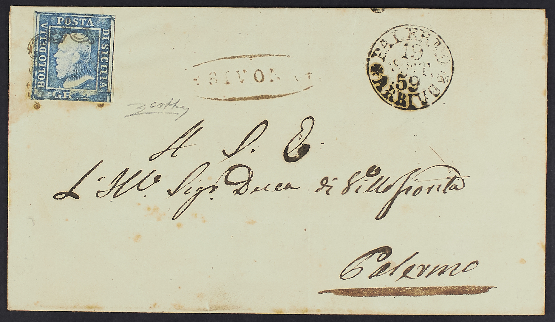 Bivona - Ovale su lettera per Palermo (arrivo 19 settembre) affrancata con 2 gr. I tavola azzurro - Da esaminare - Cert. Colla
