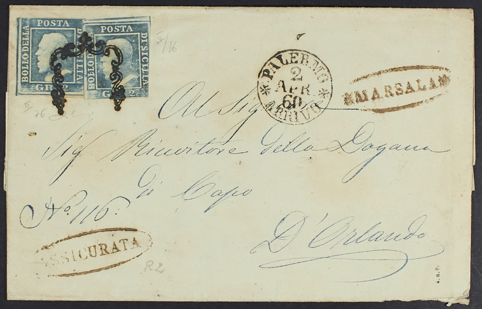 1860 - Marsala - Ovale su assicurata, ovale a lato, per Palermo (arrivata il 2 aprile) affrancata con 2 gr. II tavola azzurro due esemplari - Estremamente rara - Da esaminare - Cert. Cardillo