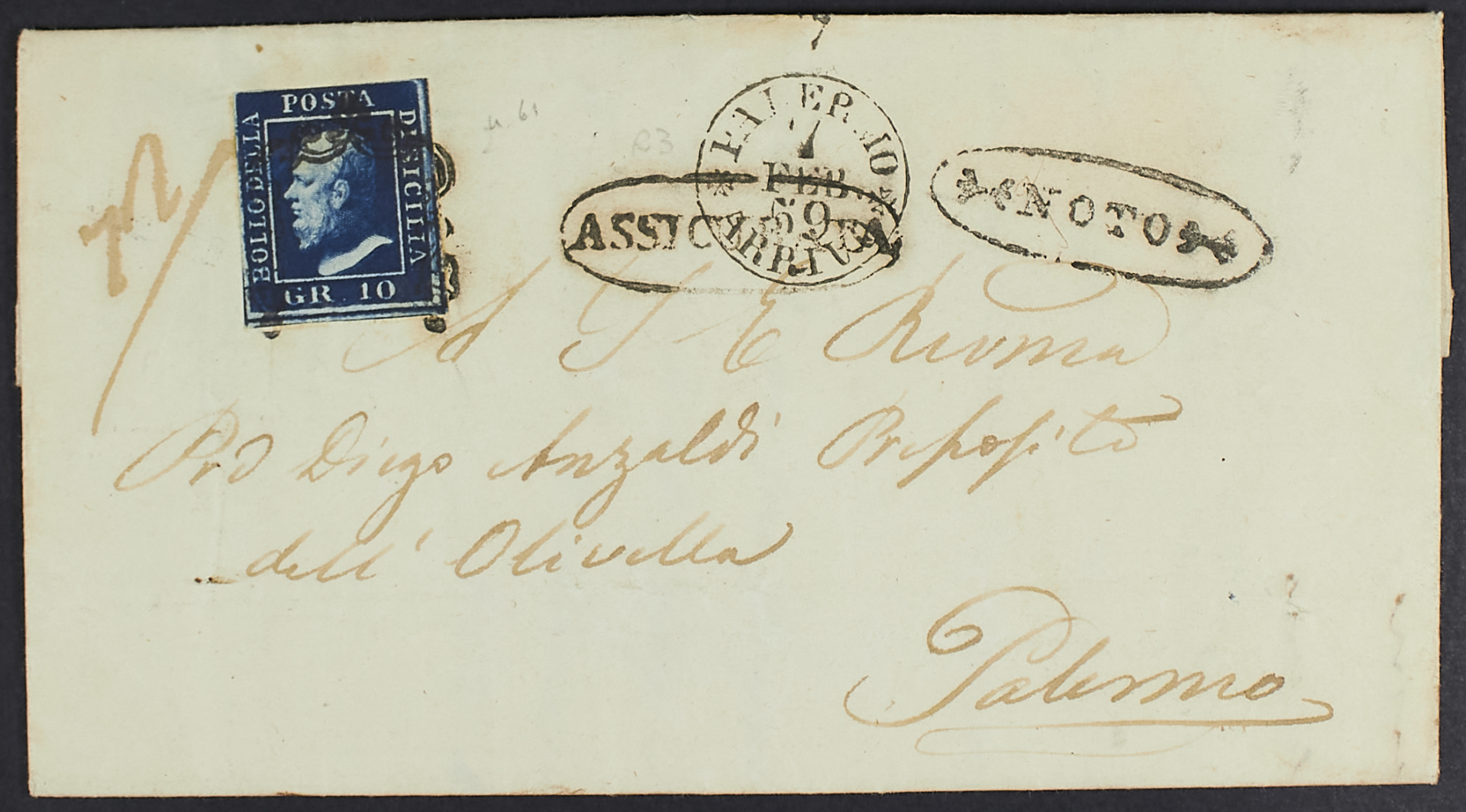 1859 - Noto - Ovale su assicurata, ovale a lato, per Palermo (arrivata il 7 febbraio) affrancata con 10 gr. azzurro cupo isolato - Documento da esaminare ma di rarità estrema