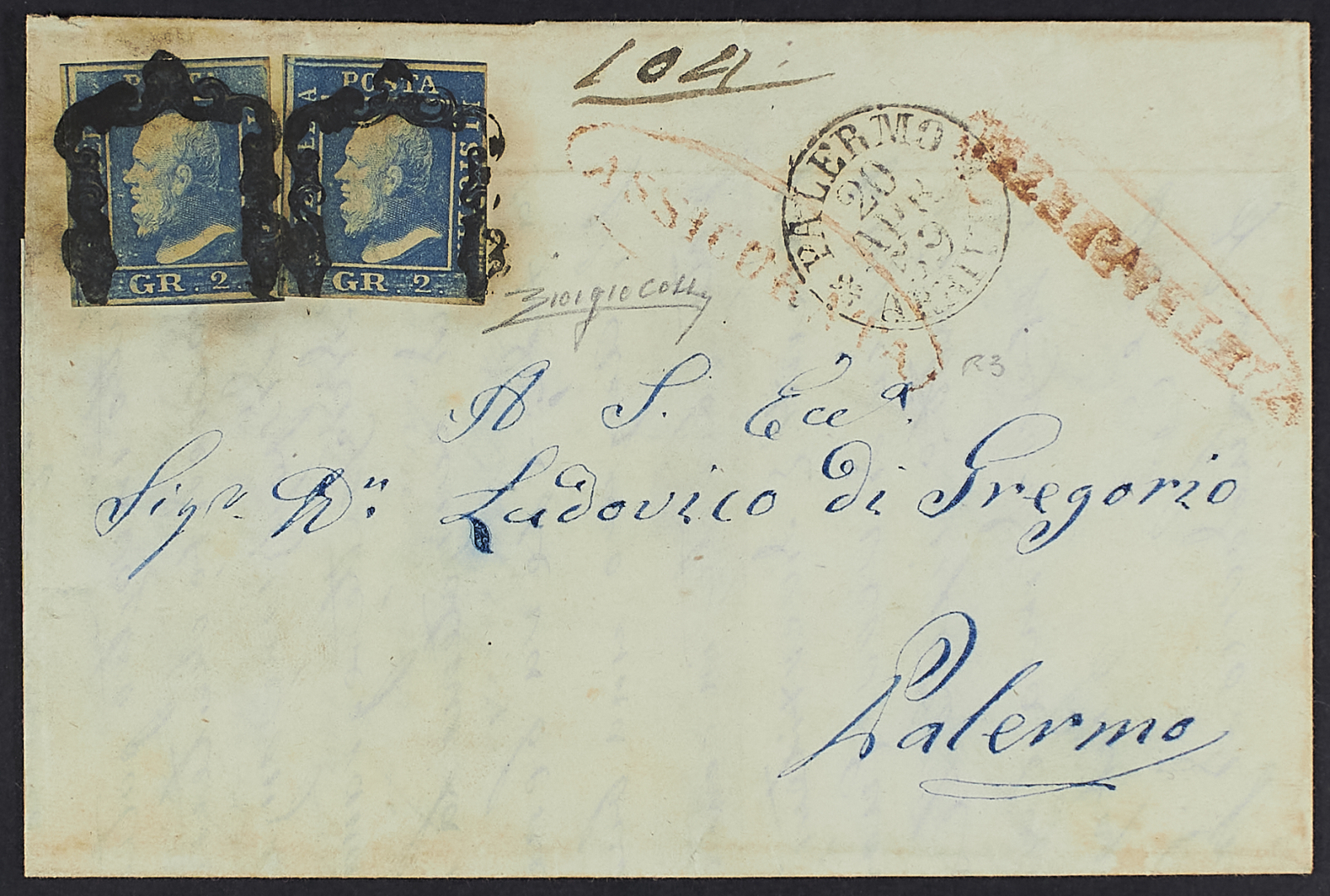 1859 - Pietraperzia - Ovale in rosso su assicurata (ovale in rosso a lato) per Palermo (arrivo il 20 aprile) affrancata con 2 gr. I tavola azzurro carta di Napoli due esemplari - Estremamente rara (tre lettere note) - Cert. Colla