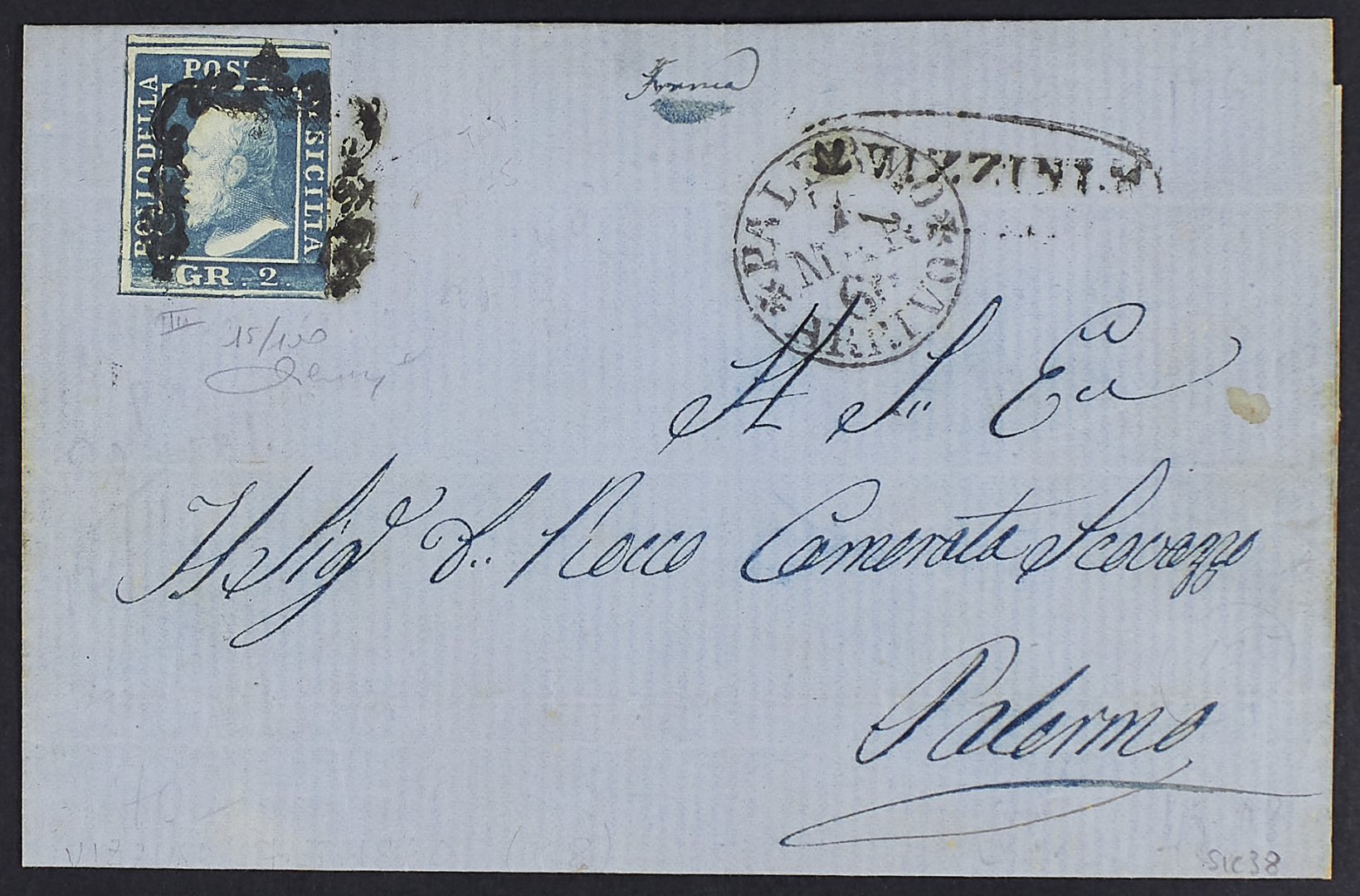 1859 - Vizzini - Ovale su lettera del marzo 1860 per Palermo affrancata con 2 gr. III tavola azzurro vivo - Molto rara e di grande freschezza - Cert. Cardillo