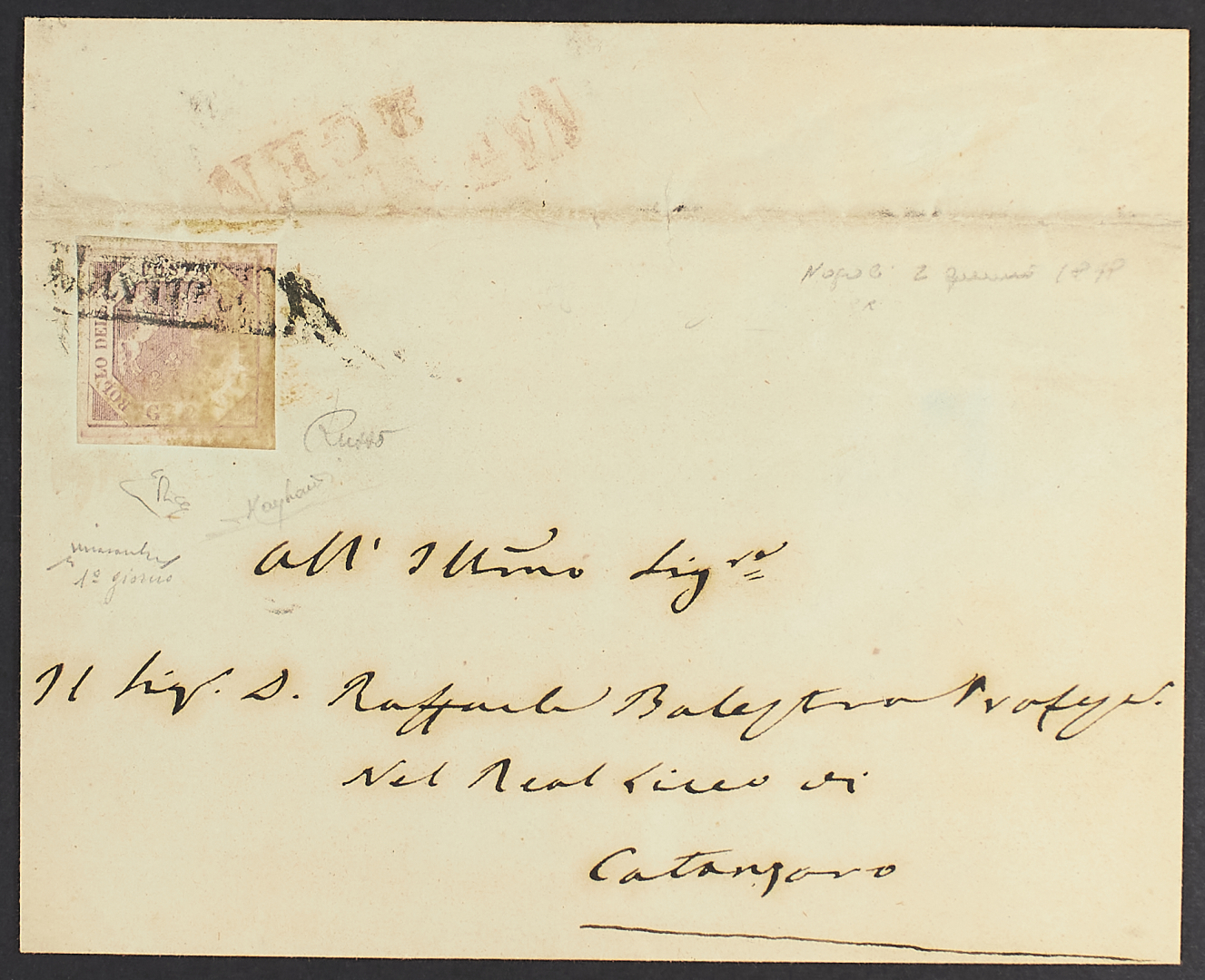 1858 - Giorno d'emissione - 2 gr. I tavola rosa lillaceo su lettera del 2 gennaio da Napoli per Catanzaro - Rara - Cert. Diena e Raybaudi - Firma Chiavarello