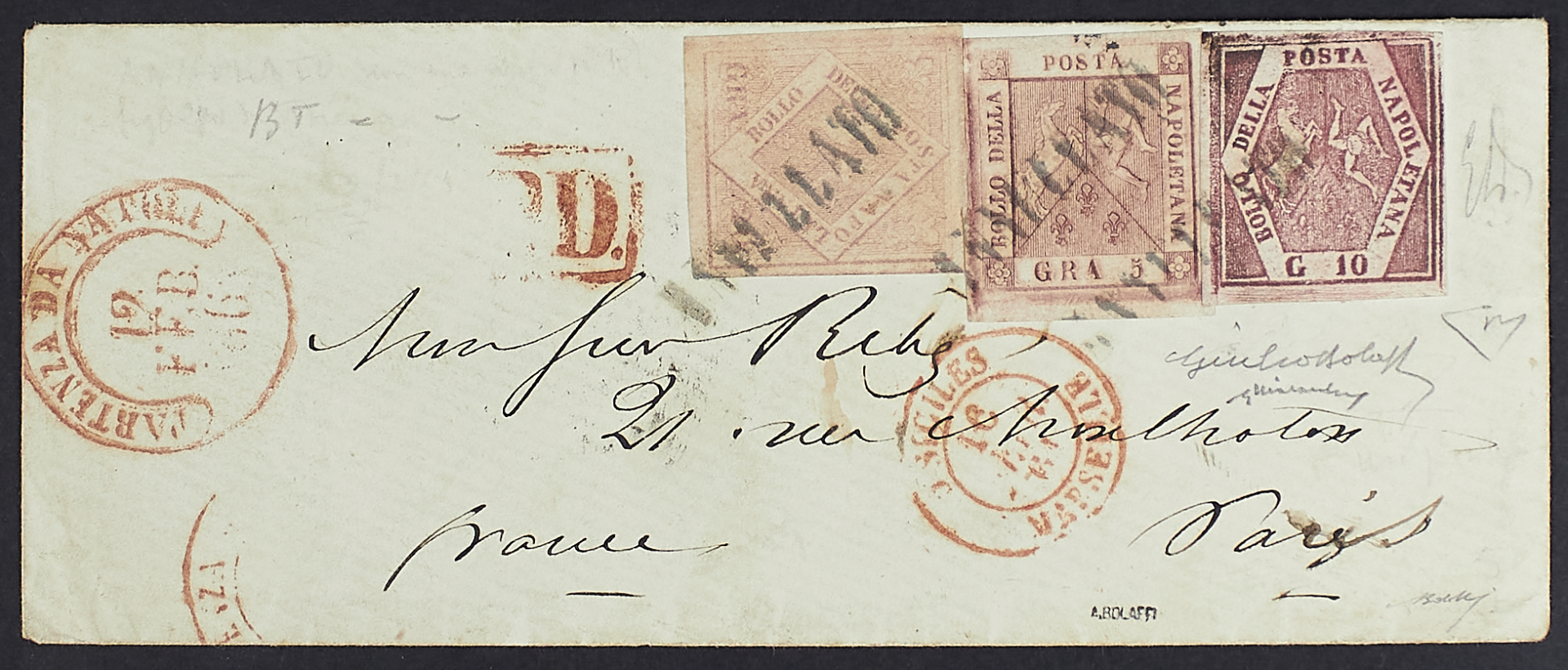 1858 - 10 gr. carminio lillaceo V tipo in affrancatura "tricolore" con 5 gr. II tavola rosa chiaro su busta del 12 febbraio 1861 da Napoli per Parigi - Splendida e rara - Cert. Diena - Firme Giulio Bolaffi, A.G. Bolaffi e Chiavarello