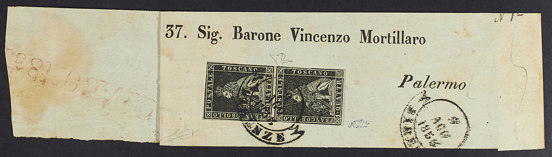 1852 - 1 q. nero su carta grigia coppia verticale su fascetta per spedizione giornali del 9 agosto 1855 da Firenze per Palermo - Cert. Diena - Firma Raybaudi