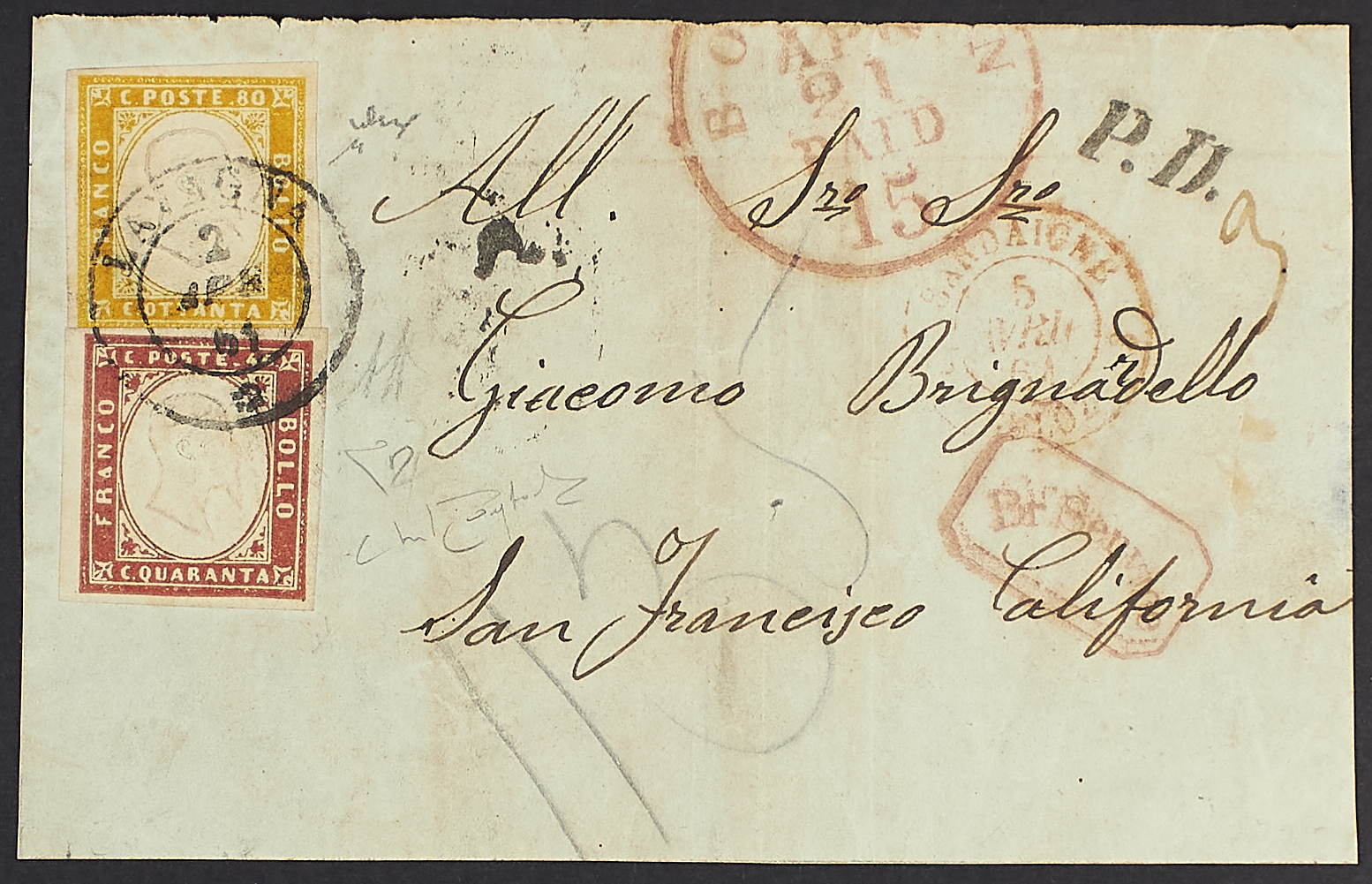 1855/62 - 40 c. carminio lillaceo + 80 c. giallo arancio su frontespizio di lettera del 2 aprile 1861 da Lavagna per S. Francisco - Unita lettera del 26 gennaio 1863 da La Pietra per S. Francisco con 80 c. giallo arancio in affrancatura mista con Regno prima emissione dentellata 40 c. rosso carminio - Da esaminare - Cert. Diena - Firme Chiavarello e Raybaudi