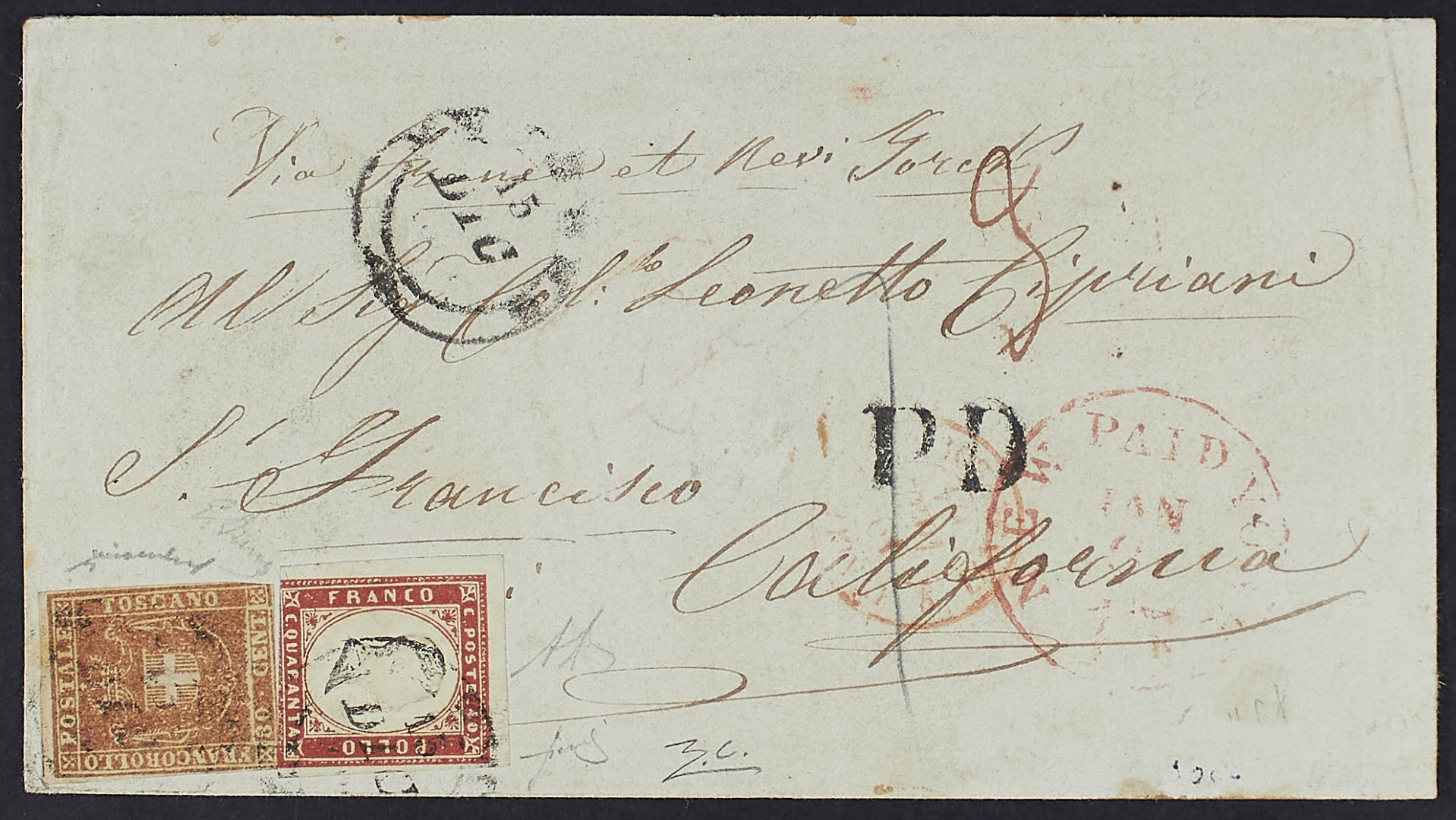 1855/60 - 80 c. bistro carnicino in affrancatura mista con Sardegna IV emissione 40 c. rosso vermiglio su busta del dicembre 1861da Livorno per San Francisco - Rara - Da esaminare - Cert. Colla e Fiecchi - Firma Chiavarello e A.D.