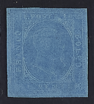 1853 - 20 c. azzurro - Raro e con rilievo ben impresso - Cert. Cardillo