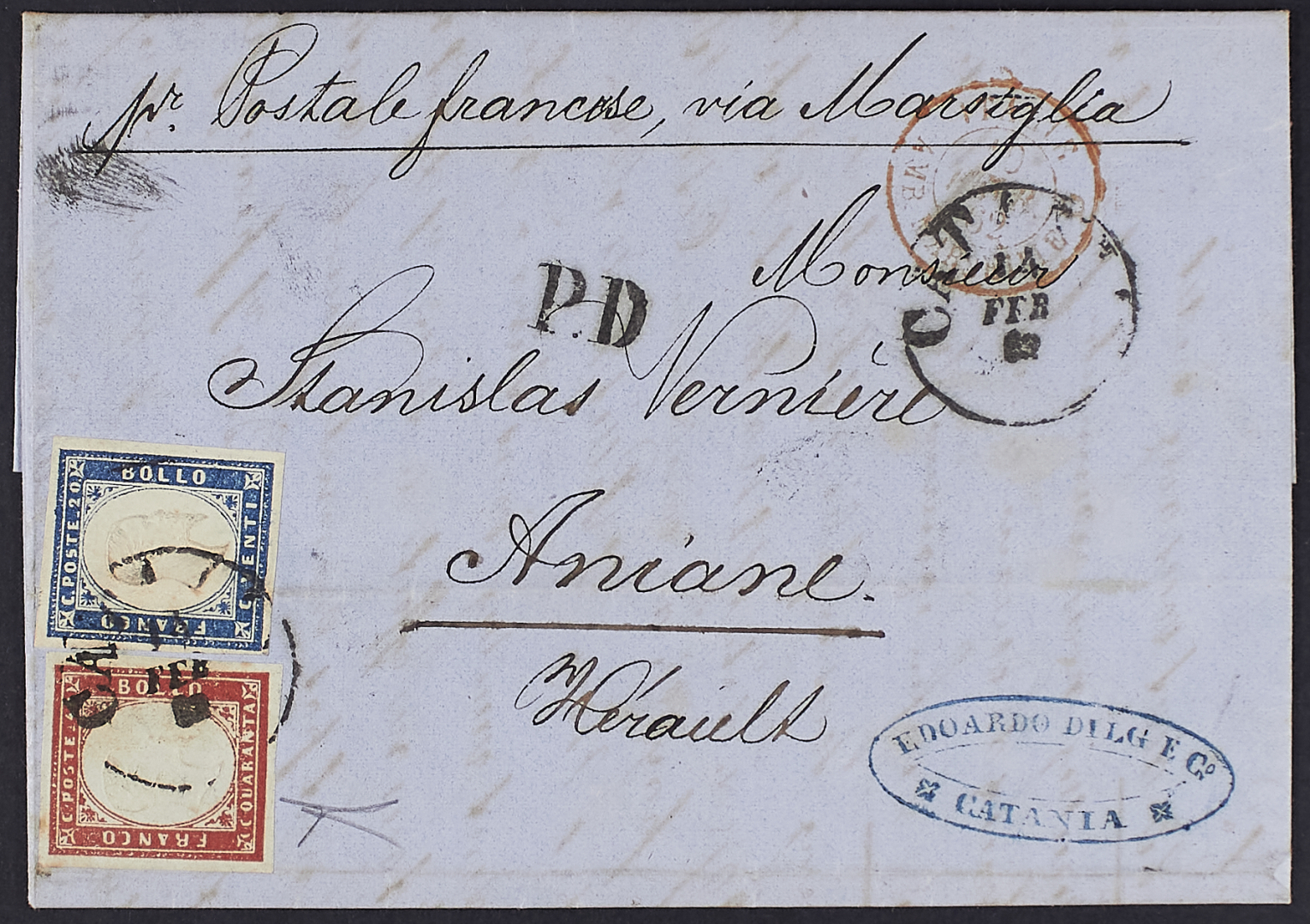 1855 - 20 c. celeste grigiastro + 40 c. vermiglio mattone su lettera del 14 febbraio 1862 da Catania per Aniane (Francia) - Piega d'archivio che interessa il 20 c. - Cert. Bottacchi