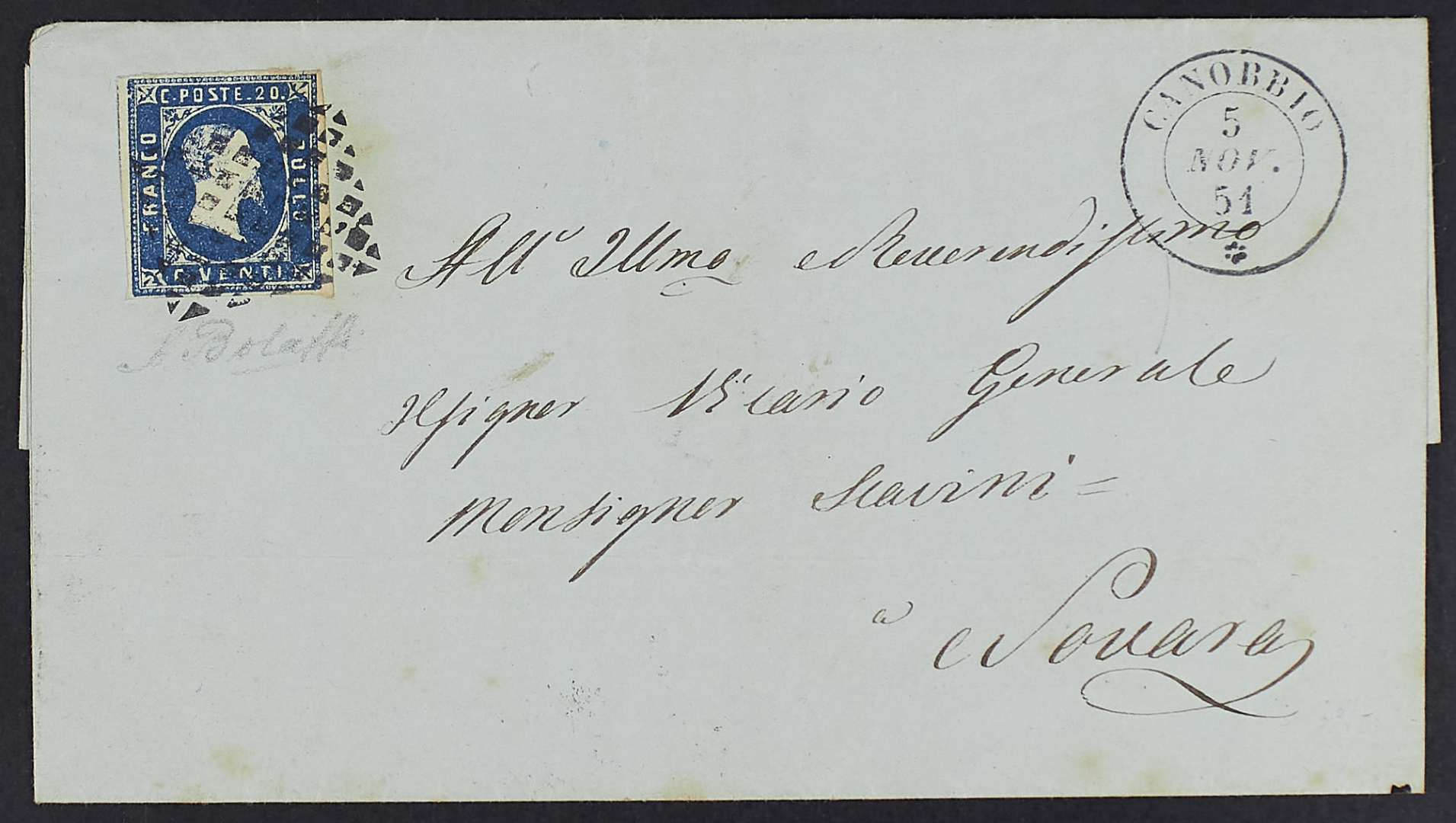 1851 - Cannobio - Rombi annullatori di I emissione 20 c. azzurro, doppio cerchio con rosetta a lato, su lettera del 5 novembre per Novara - Splendida e rara - Firma A. Bolaffi